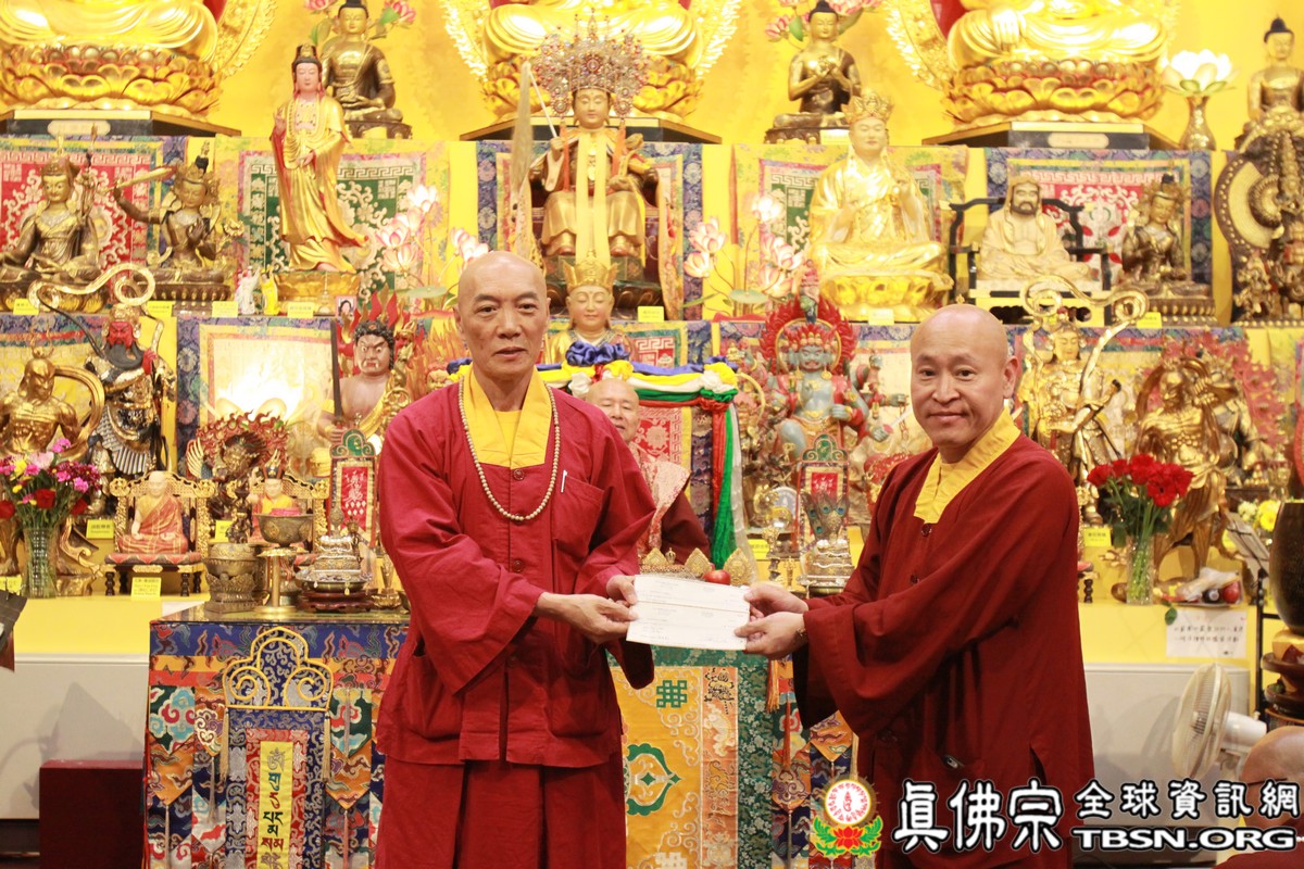 在根本上師的傳承加持下,同修莊嚴圓滿。同修結束後,隨即舉行隆重的捐贈儀式,由尊勝雷藏寺代表蓮僧上師,將6月30日羅天大醮大法會的部份收入及供僧善款的餘額贊助宗委會,由宗委會財務處處長蓮印上師代表接受。
