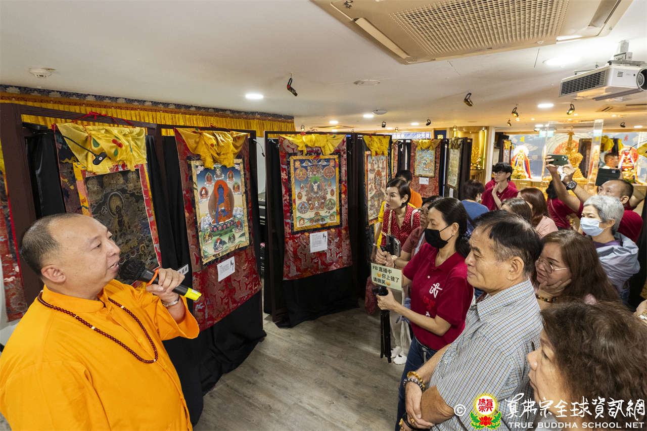 吐登卡瑪仁波切,為現場的唐卡做一系列的介紹與導覽,畫師將各經典中描述的佛菩薩諸尊,描繪顯現在唐卡上,首先介紹的是黃教的皈依樹唐卡,這幅唐卡最中間的主尊釋迦牟尼佛是由黃金繪製,周圍圍繞了層層的眷屬與護法,細膩精緻畫風引起現場眾人的圍觀讚嘆,觀者皆心生法喜。