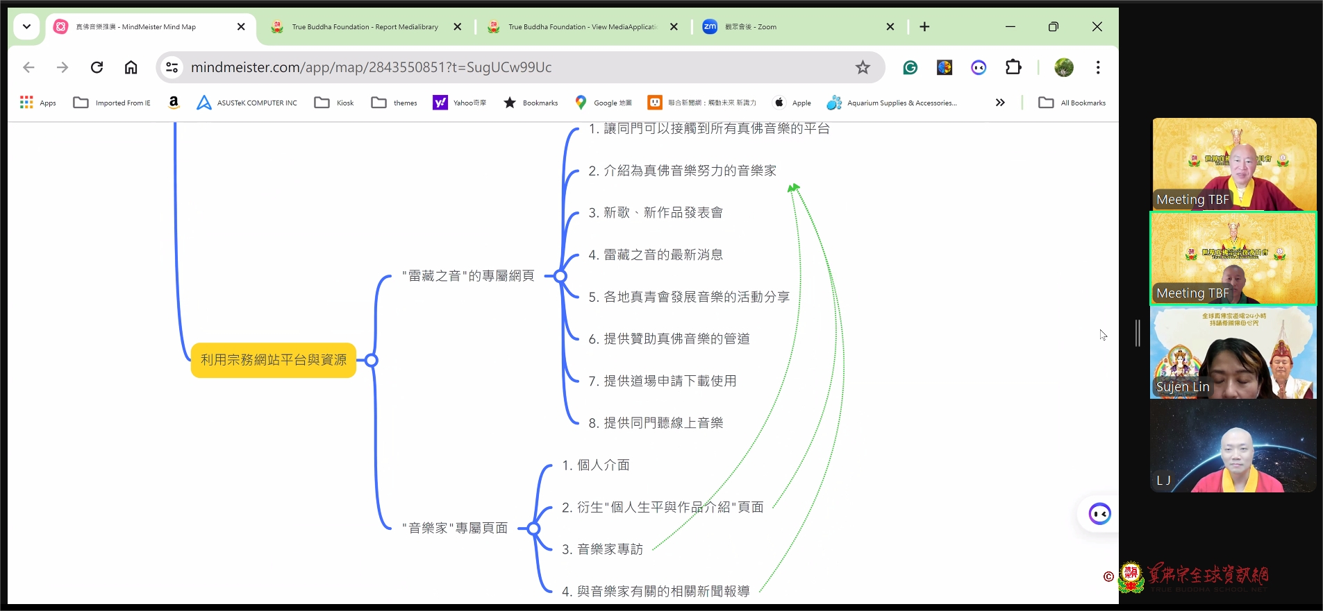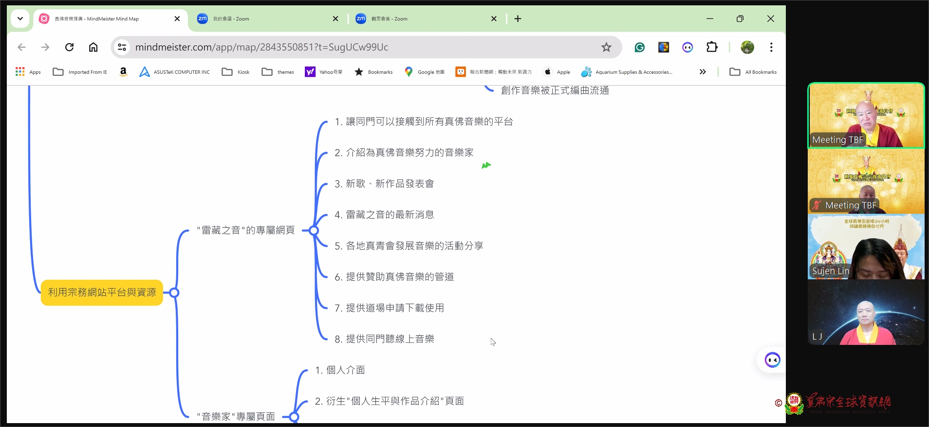 首先,蓮僧長老說明,在西宗辦常會收到來自許多熱愛音樂的同門,將自己的創作供養師佛。師佛私下亦有指示,可以創建平台提供給這些音樂愛好者發揮。目前雷藏之音對於諸尊心咒的音樂創作頗受好評,在youtube頻道的點閱率也逐次增加,接下來就是對於個人創作的項目。於是將規劃透過宗務網站的資源,建立雷藏之音的專屬網頁,發揮真佛音樂協作/創作平台功能。所以本次的討論內容,不僅是雷藏之音現階段諸尊心咒的創作,亦含括甄選個人的優良創作。
