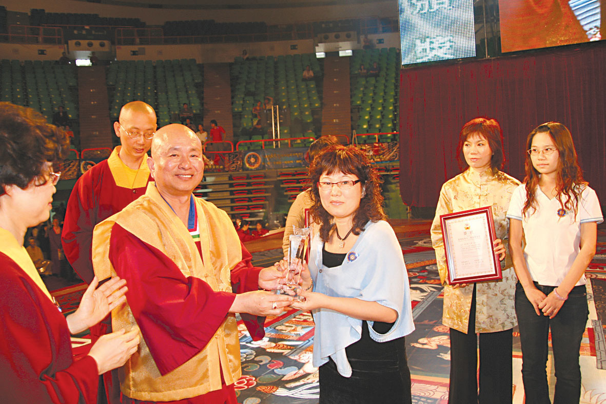 簡述:2008年5月3日時輪金剛盾大法會後感恩晚宴,盧師尊頒獎給當時 《燃燈雜誌》與《真佛報》合辦的第二屆文薪獎 得主。能從師尊手中親自得到獎杯真是畢生的榮幸!