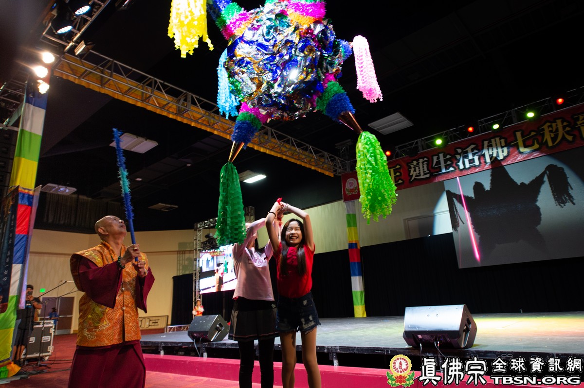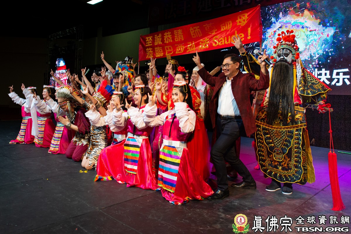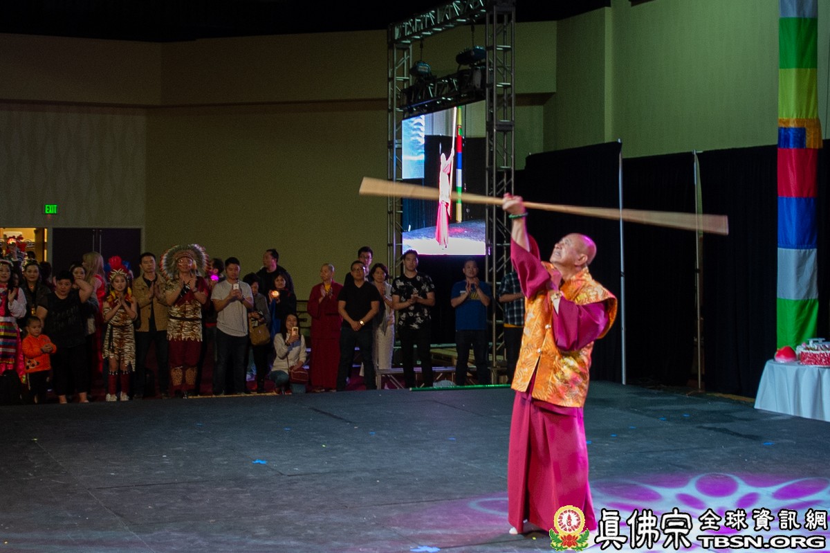 當晚除了專業歌舞表演連場,真佛宗代表有天音雅樂歌詠和師母一起呈獻的陽光舞供團舞蹈,並有由蓮訶上師「銜導主演」的笑話劇,劇中引用了不少師尊開示時說過的笑話,可見的確有做足功課,至少好好聽過師尊開示(的笑話)(一笑),大家想起師尊說過的句子,自然會心大笑,其樂融融。