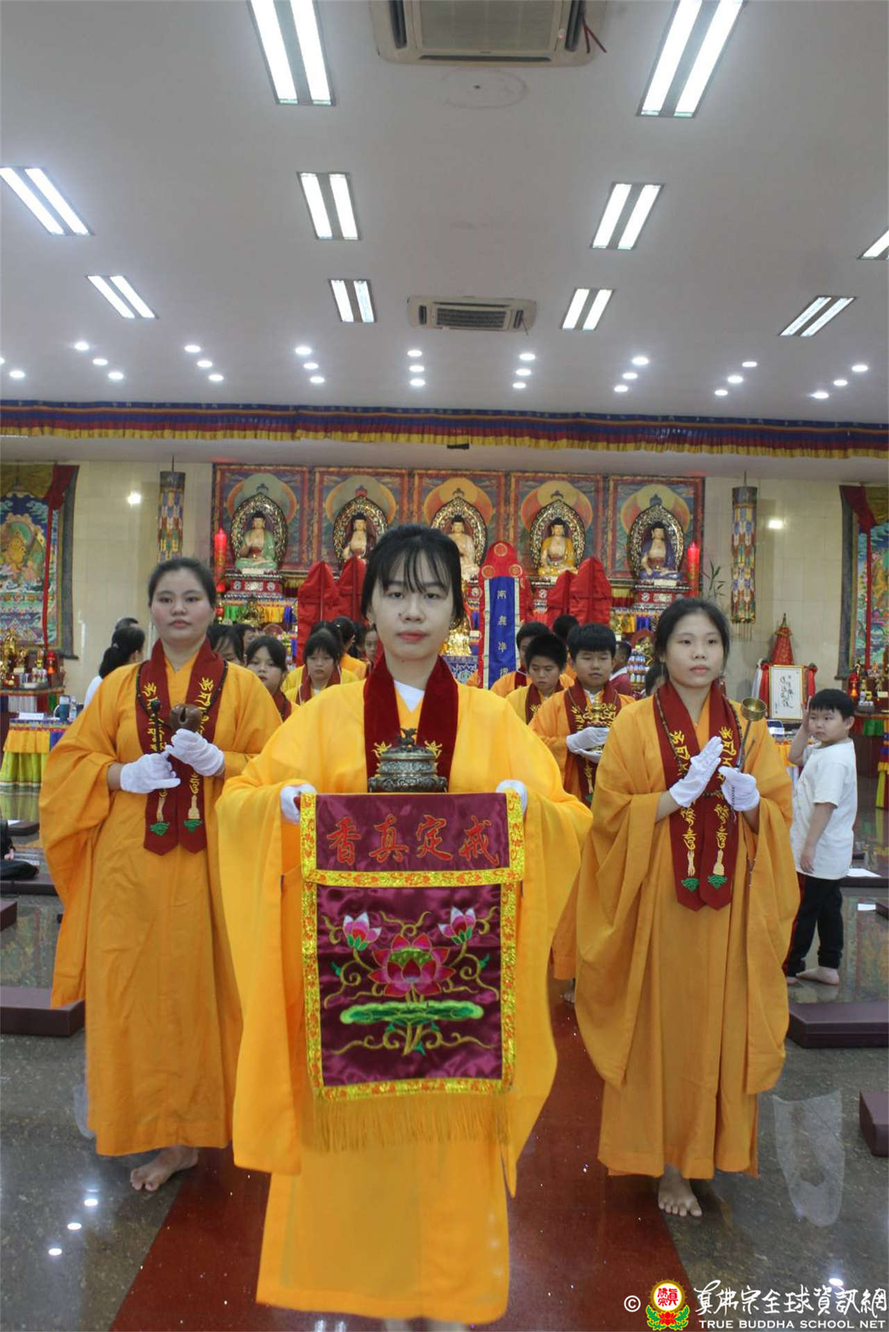7月3日上午十點法會開始,長長的迎師隊伍從樓上壇城走到樓下恭迎主壇上師入壇場。這支隊伍中有好些是小學的孩童,小手掌上戴著大白手套,捧著法器,有模有樣,非常可愛。主壇上師入壇場前,先加持了延生位及往生位,然後上香,大禮拜,入座,介紹弘法人員,敬獻哈達。