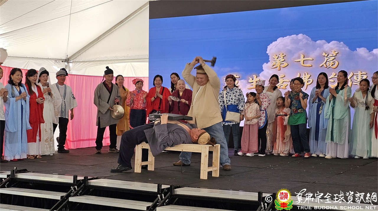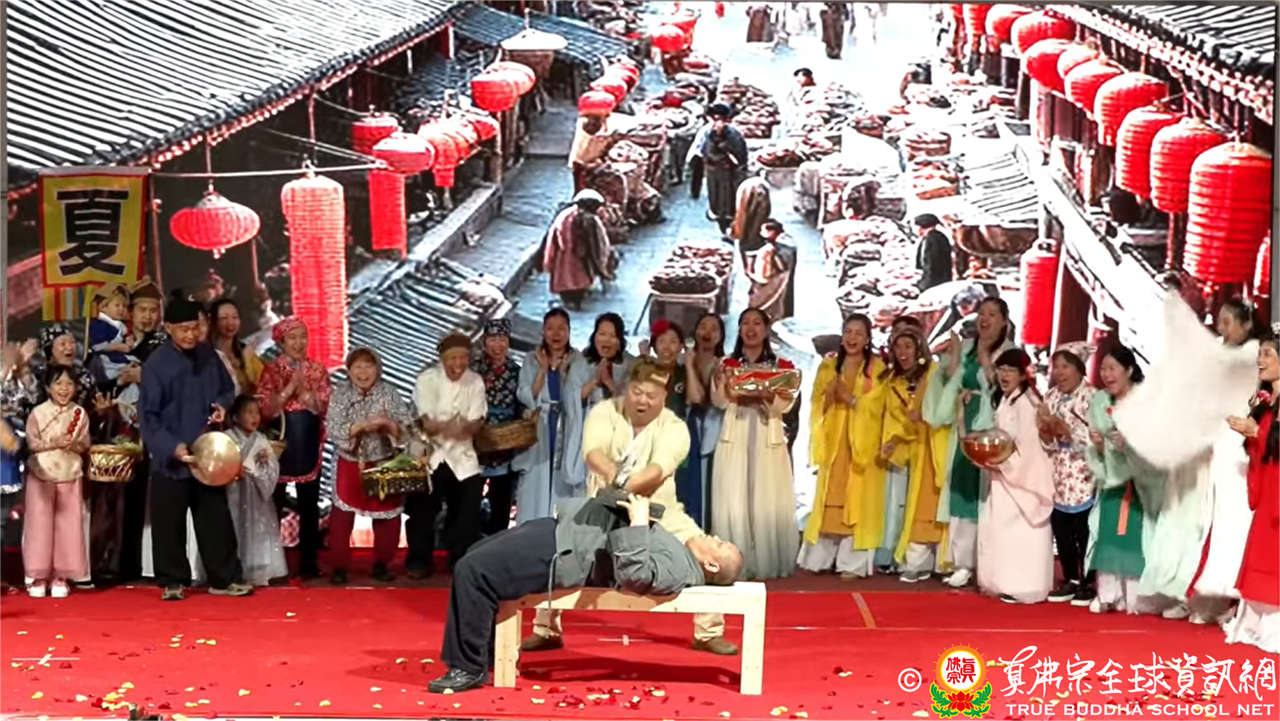 劇情演出中,其中有一場景是王朝盛世的街頭,來往的路人、叫賣小攤等。隨著敲鑼聲響起,頓時民眾自動圍成圈,好奇的來看表演,賣藝的女孩(蓮孩法師 飾)、舞劍的俠士(敬安師兄 飾)依序而上,然後兩位壯漢(李永東、廖健偉 飾)踩著有力的腳步聲登場,原來是要表演「胸口擊石」 ,圍觀的群眾配合著吆喝聲,一個大槌而下,擊碎在胸口上的大石,贏得一陣喝采。