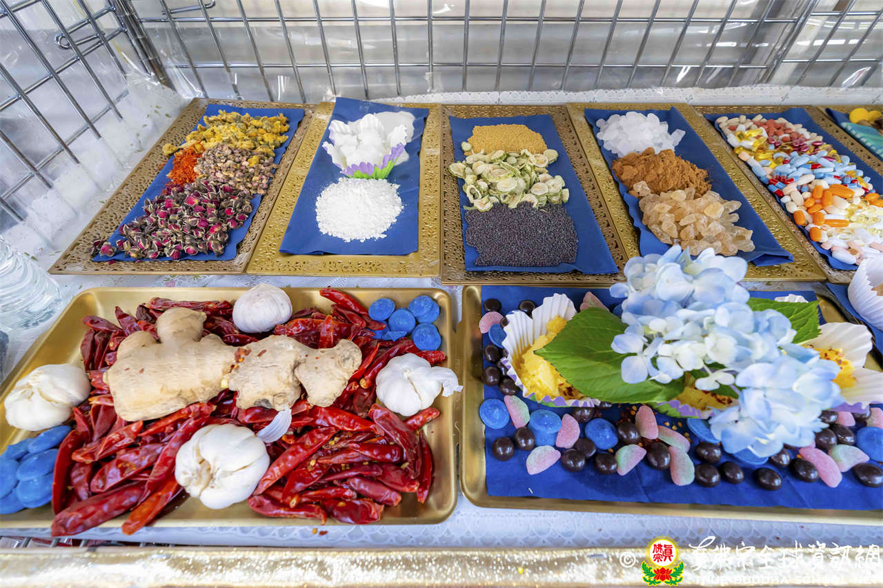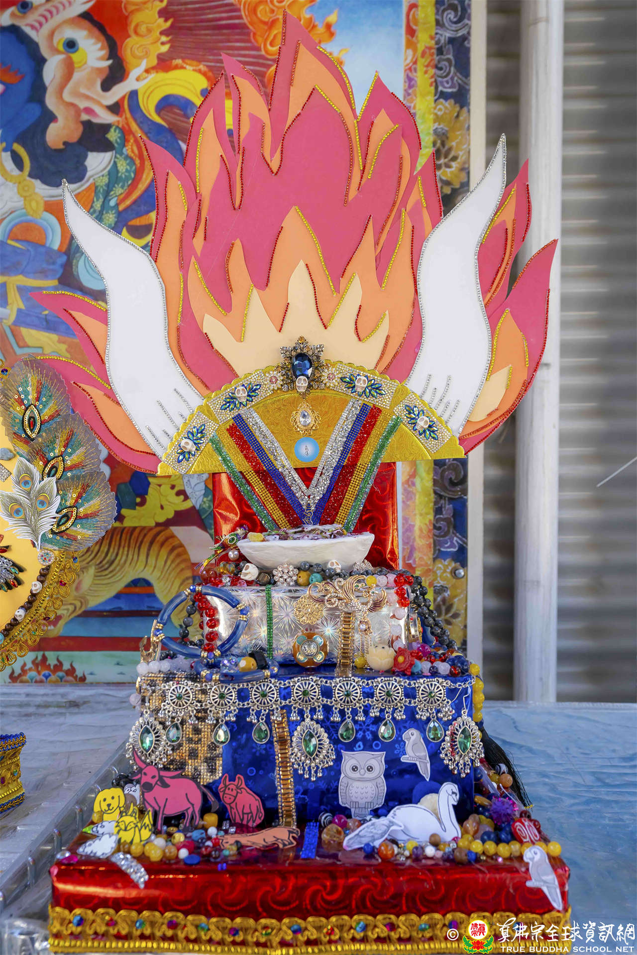 今日護摩主尊是大威德金剛,六面六臂六足騎著青色的水牛,由文殊師利菩薩化現。文殊師利菩薩見地獄道十殿閻王兇暴殘害生靈,大威德金剛變化為降閻魔尊對抗閻羅王,很多人把閻羅王就看成大威德金剛,兩者有點像,但不完全一樣。大威德金剛有很多隻手、很多腳、很多面孔,頂上是文殊師利菩薩,有的會騎在牛背上象徵降伏閻羅王。大威德金剛有很多形象,有一面二臂二足,有九面三十四臂十六足,有三十二面孔三十六臂,稱十三尊大威德金剛,可降伏四魔(煩惱魔、天魔、病魔、死魔),也是宗喀巴祖師根本護法,幫助宗喀巴祖師度過許多死難,是威力最大的一個護法。彩虹雷藏寺護法殿金剛明王殿主尊就是大威德金剛,法力跟佛一樣,大威德金剛等同佛。