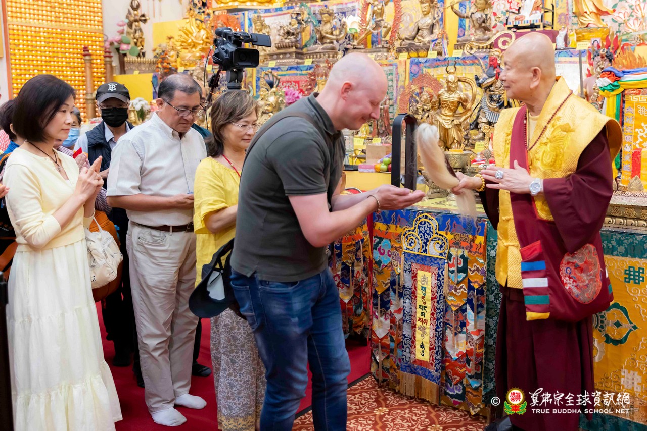 聖尊講解維摩詰經後,為新皈依者做皈依灌頂,加持大悲咒水,並以拂塵一一加持與會大眾。
