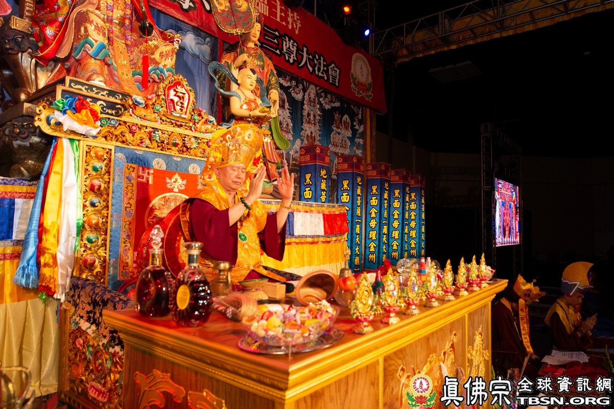 法會開始由法王帶領僧眾依「羅天大醮儀軌」做清淨、以雷劈木做三次召請,召請諸佛菩薩、諸尊、眾神、金剛護法、空行諸天,加持護念!再次召請黑令旗主、焦面鬼王及【地藏經】所有鬼王,最後召請三世無主孤魂,敬獻大曼達供養,法王並宣布眾弟子所持誦經咒總數迴向此次法會: