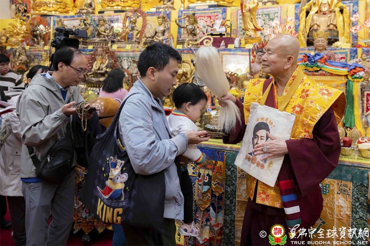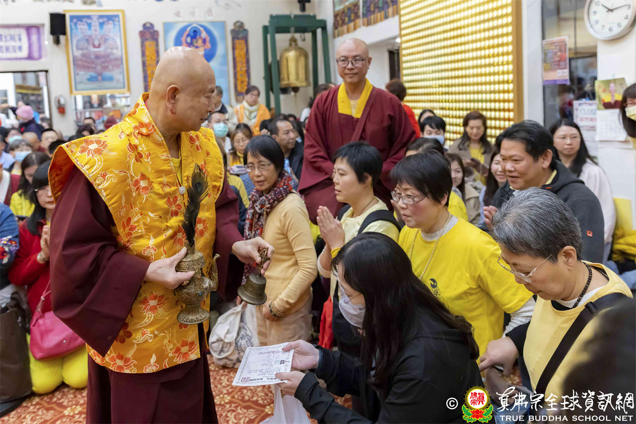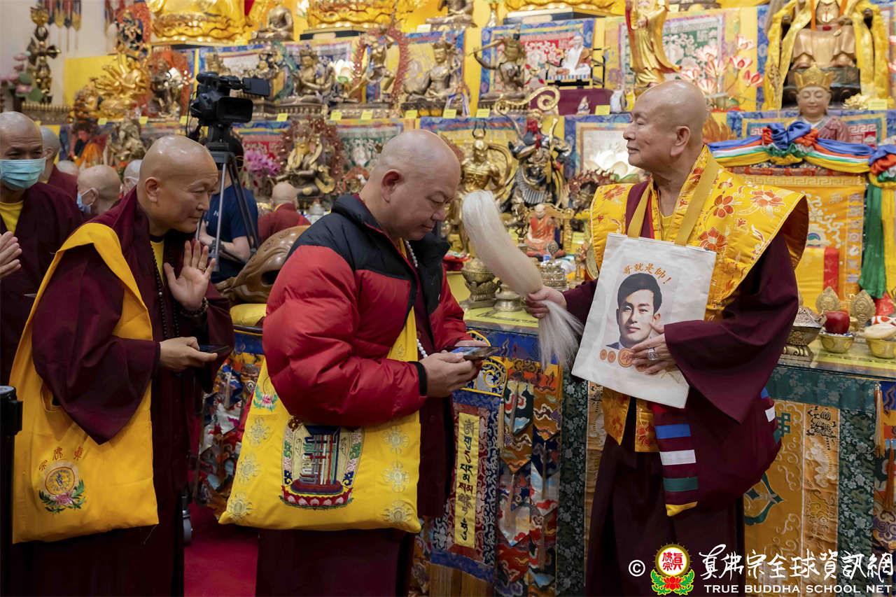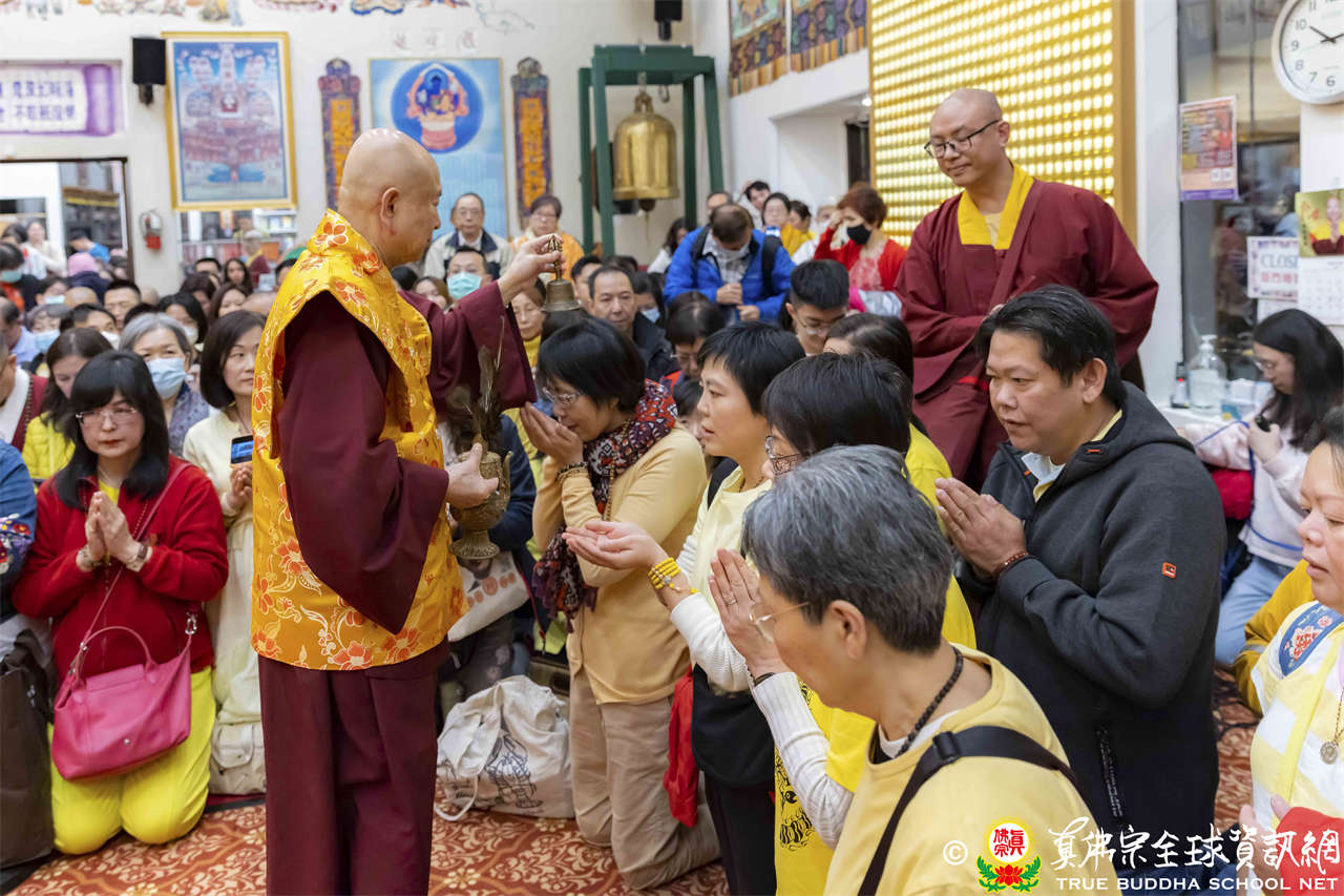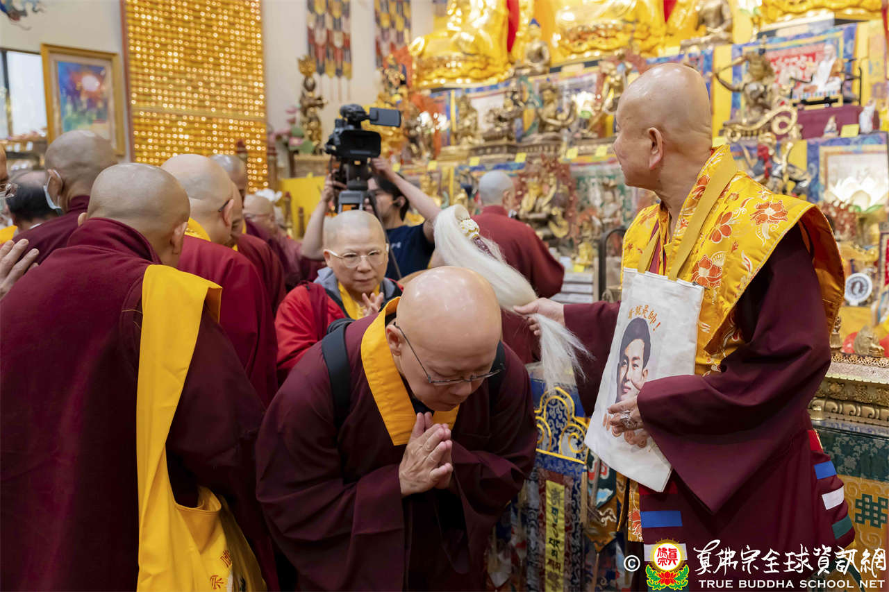 聖尊精彩寶貴的法語開示後,慈悲為新皈依弟子做皈依灌頂、加持大悲咒水、開光佛像,及持拂塵加持與會大眾。