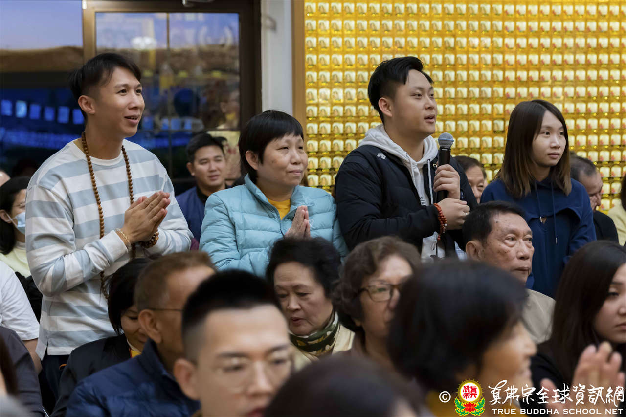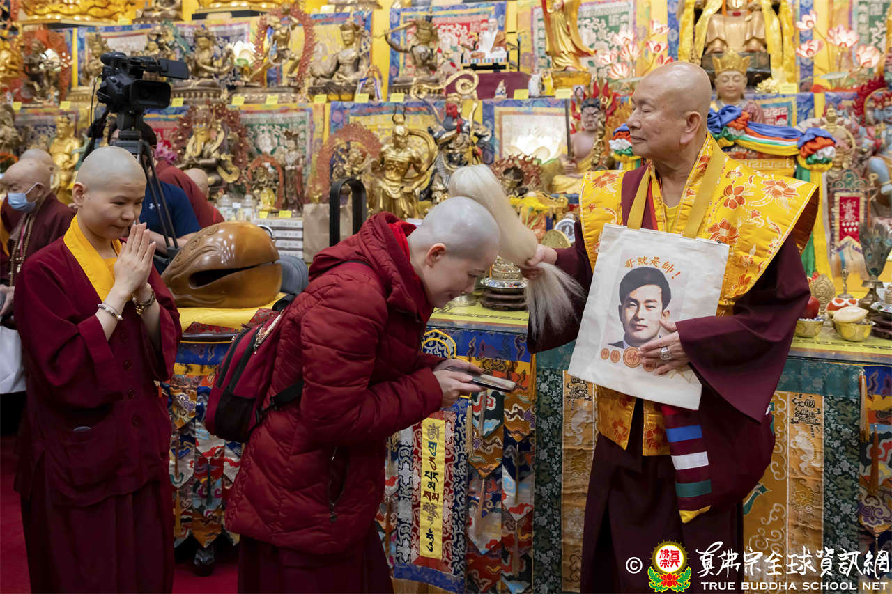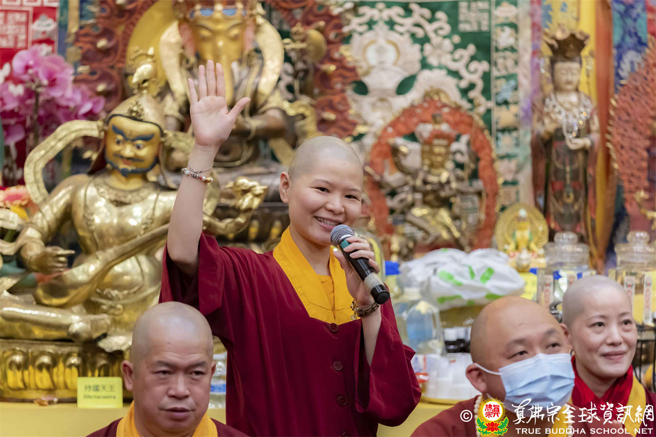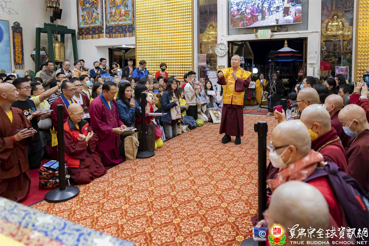 聖尊精彩寶貴的法語開示後,慈悲為新皈依弟子做皈依灌頂、加持大悲咒水、開光佛像,及持拂塵加持與會大眾。