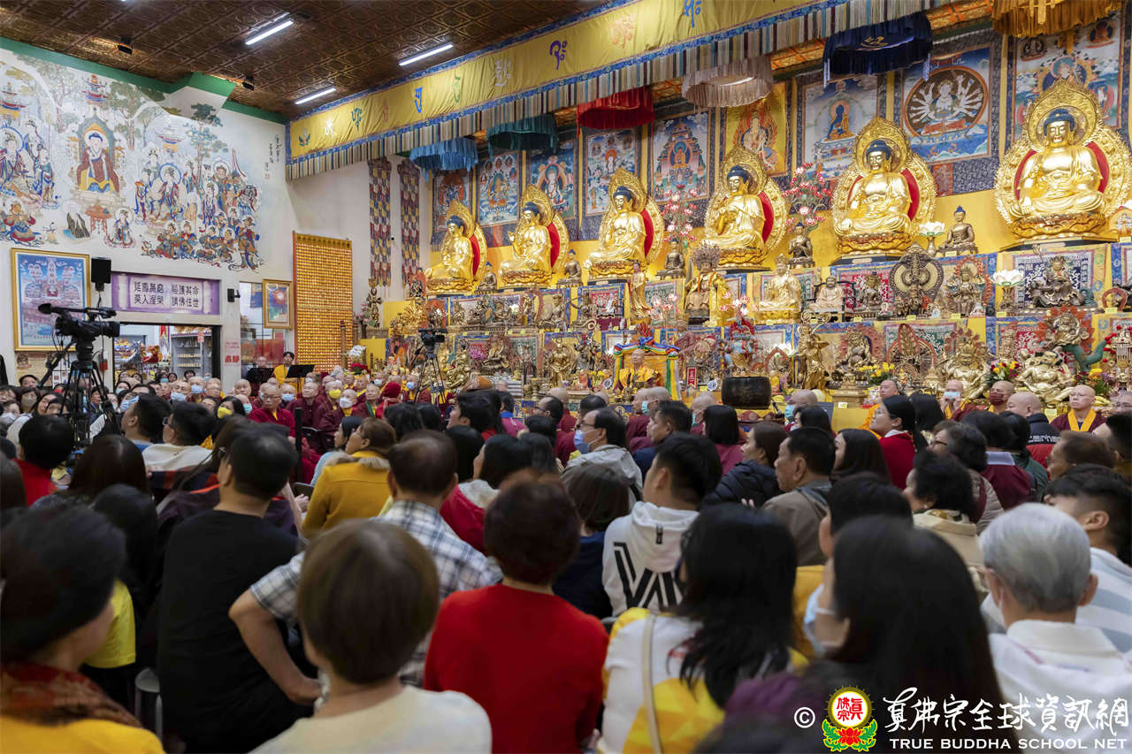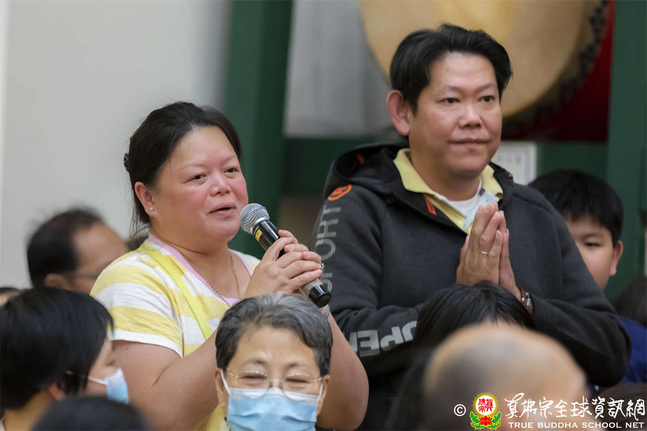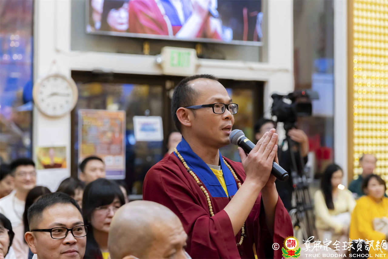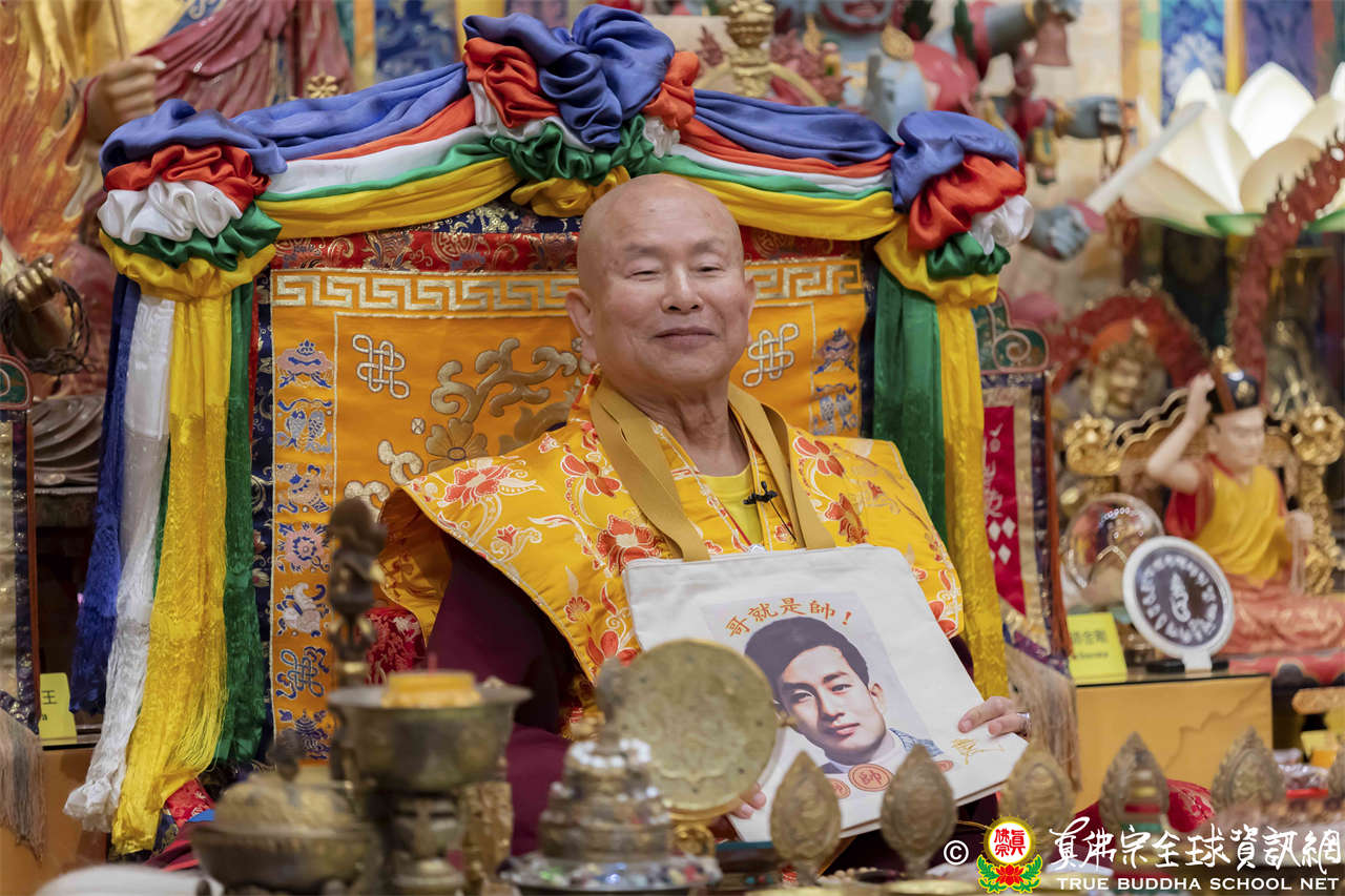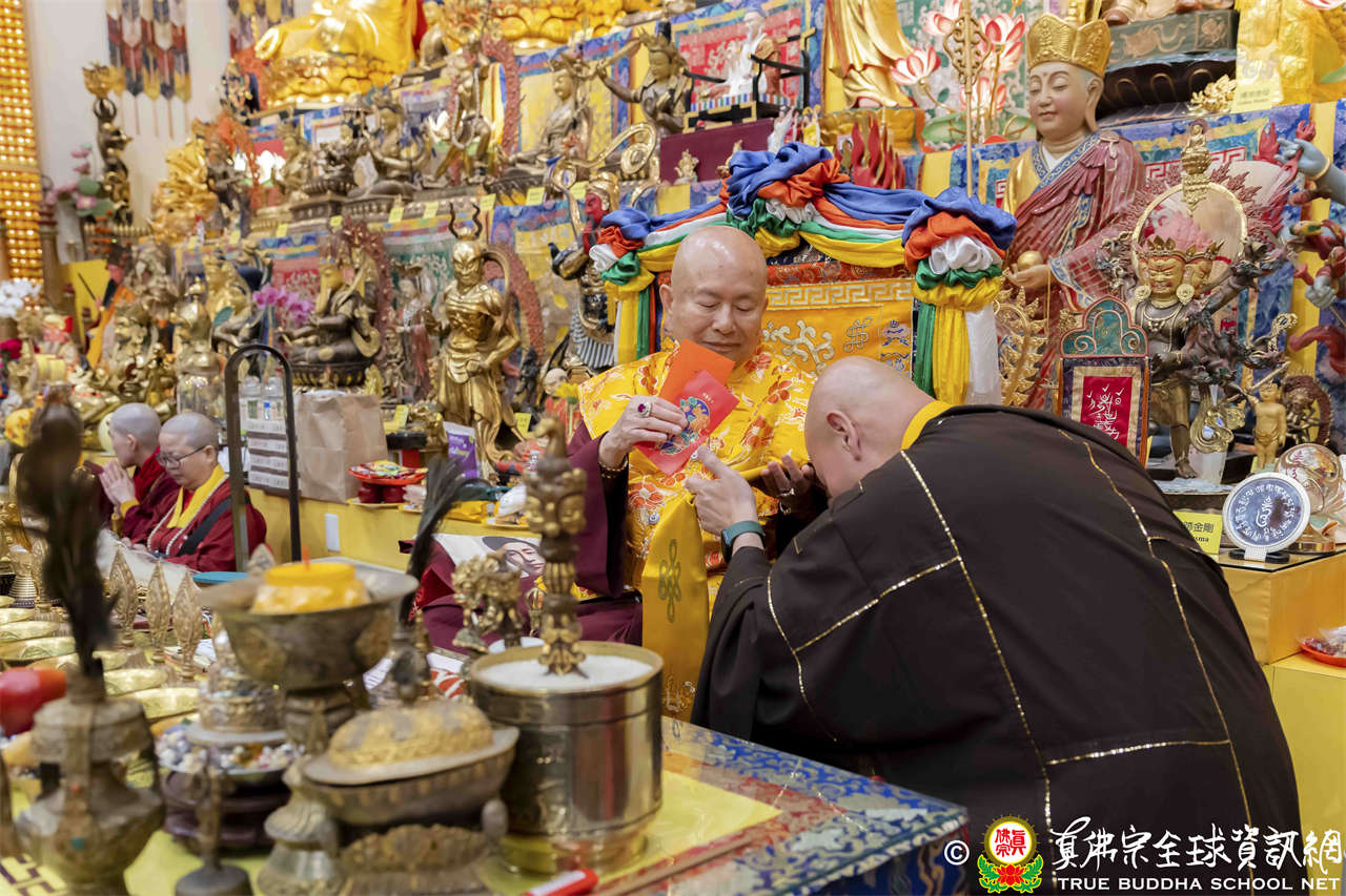 聖尊精彩寶貴的法語開示後,慈悲為新皈依弟子做皈依灌頂、加持大悲咒水、開光佛像,及持拂塵加持與會大眾。