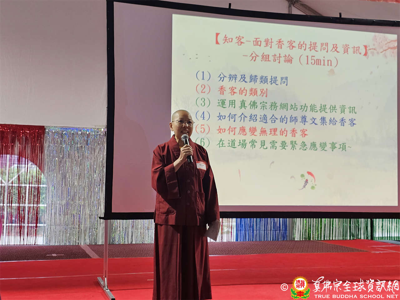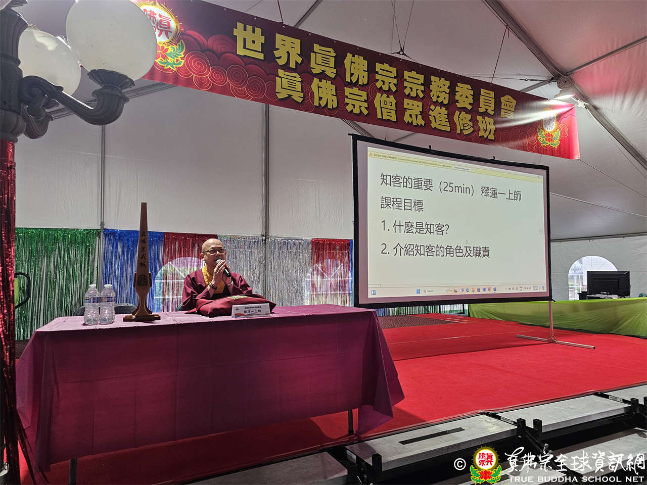 第一堂課登場的是「知客的重要」,由蓮一上師主講。「知客」於字面上的解釋為「知曉客人」,可謂各道場第一線接觸來訪者的人,亦是道場與外界之間的重要聯繫人,角色非常重要。往往來訪者的第一印象也取決於知客的態度,所以推動法務興旺,道場務必要重視知客的培訓計畫。