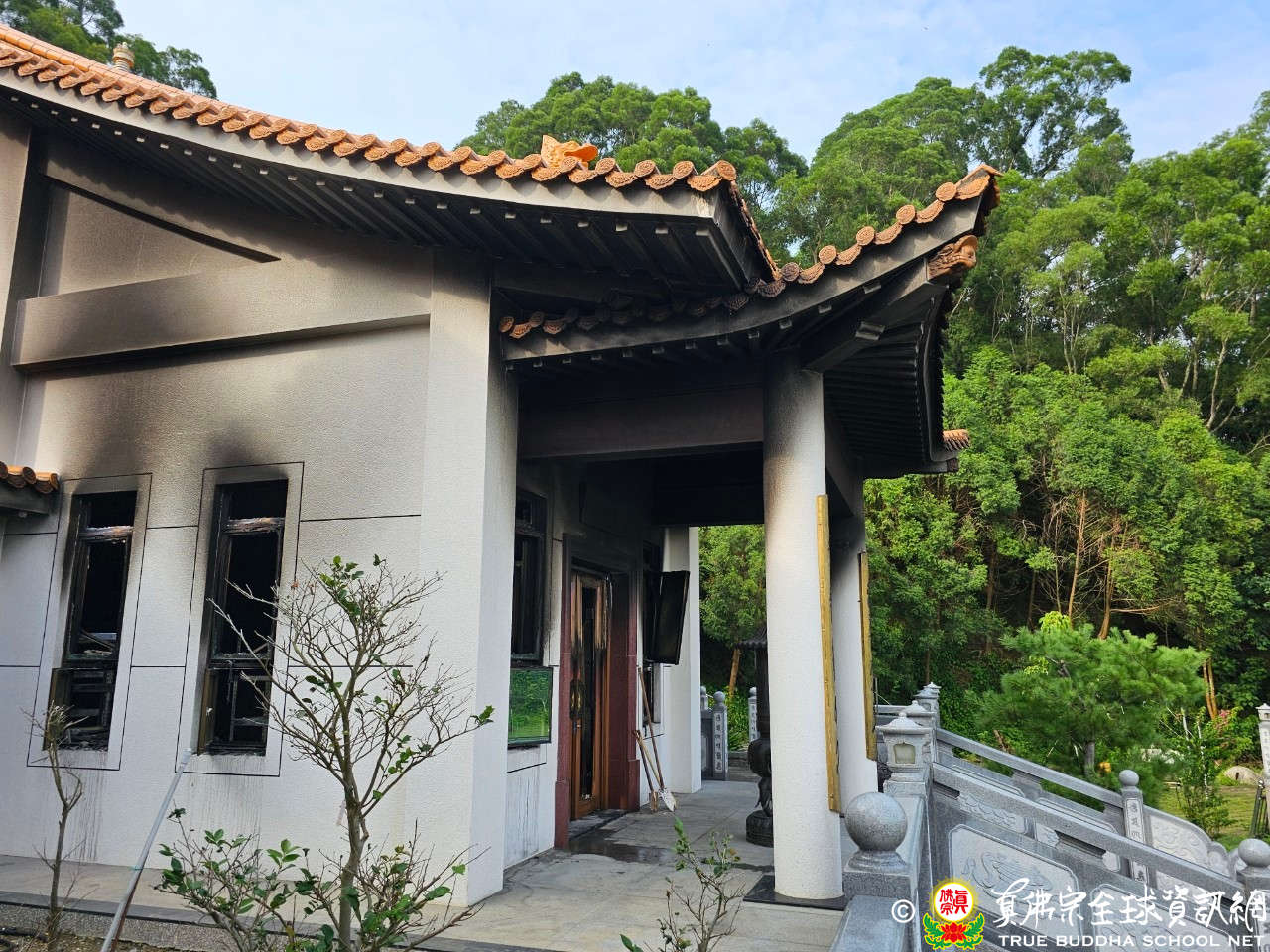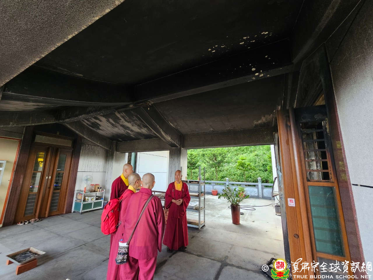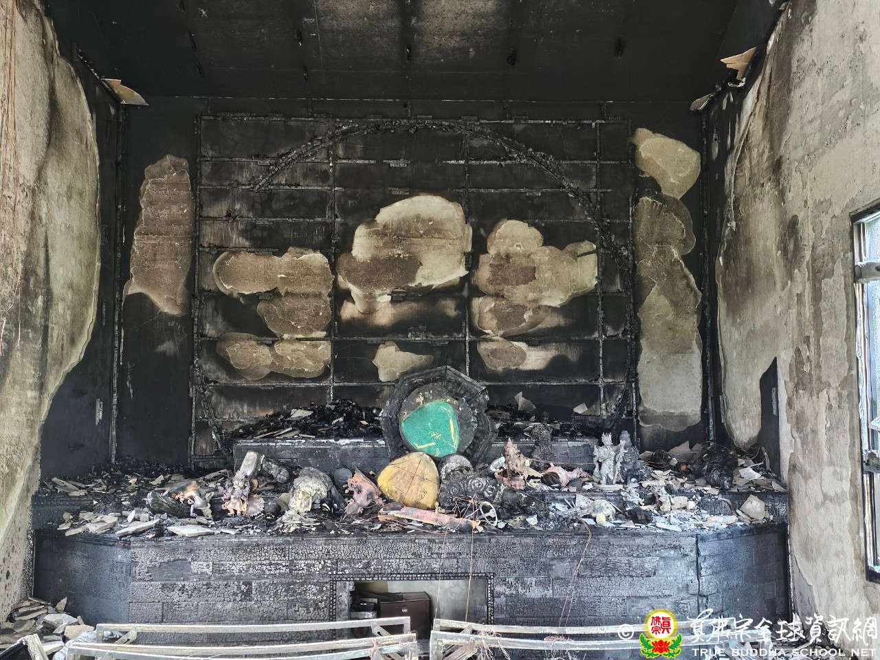 這次的探訪中,親臨火災發生點「觀音殿」,殿內全數燒毀,包含密壇的三十二尊佛像,門窗也因為高溫而變形,地板全是瓦礫碎片,令人觸目驚心。所幸當初天花板使用防火建材,僅是觀音殿內部受災,外牆則是被煙燻黑了,其他各殿無恙,沒有人員傷亡。