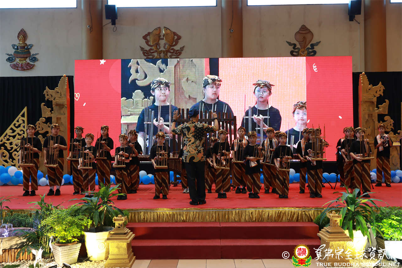 今日蒞臨的上師除了蓮飛上師,還有大覺堂的蓮樣,蓮妗上師,及馬來西亞的蓮一上師。下午三點多,整個大殿已經座無虛席。節目開始,首先大眾起立唱國歌。然後是敬德學校的小學生表演昂格浪樂曲,印尼雷藏寺佛學班學生唱“感恩真佛”宗歌,大屏幕上放出師佛蒞臨為印尼雷藏寺開光安座的照片,以及一些前輩們的照片,令人勾起無限回憶。