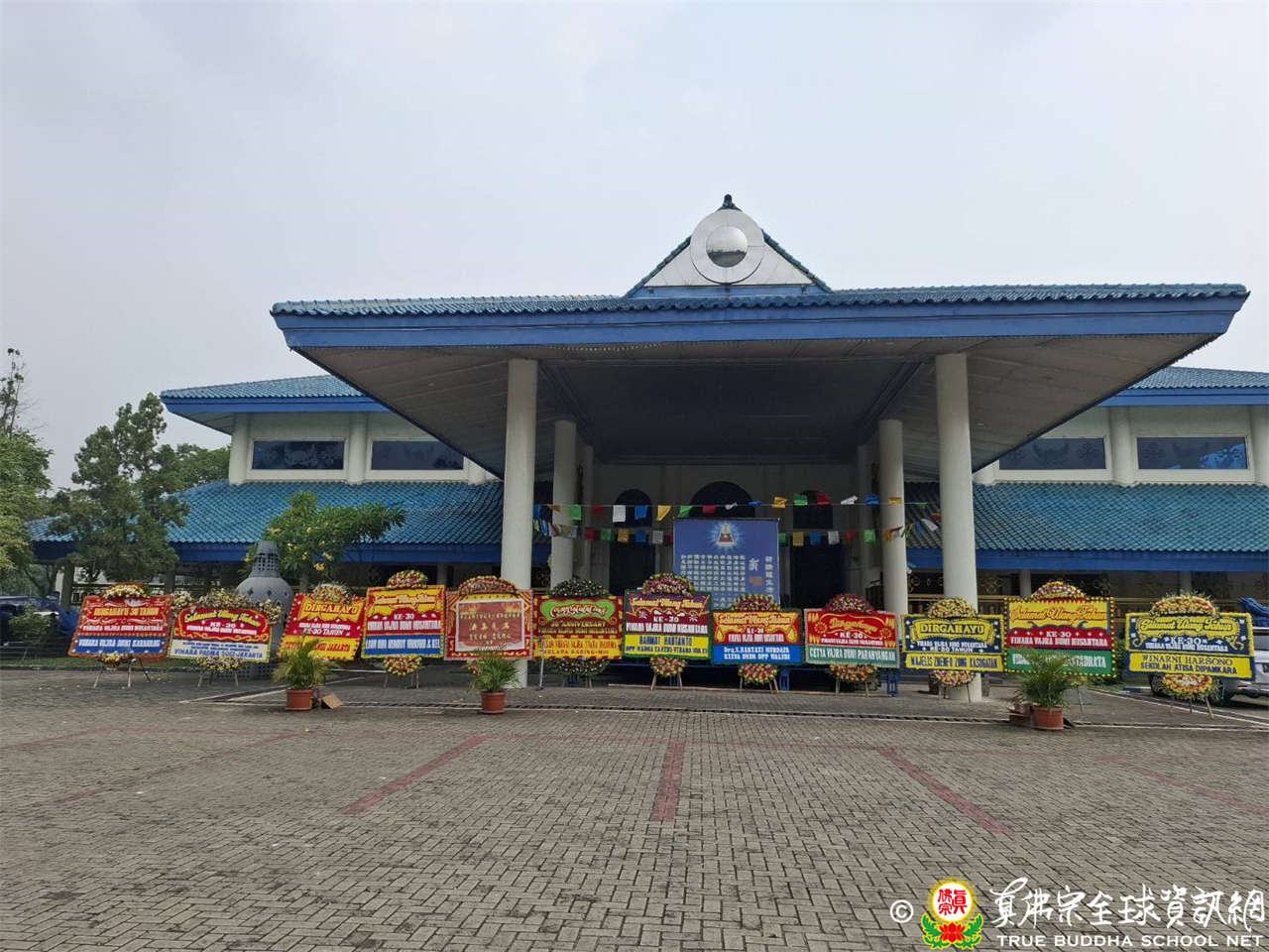 到了下午兩點,各地的同門,分堂代表陸續來到印尼雷藏寺,大殿門口有迎賓組,簽到組,請賓客簽名並發給號碼牌,有專人帶領入座。在等待節目開始前,舞台上的大屏幕不斷地播放著印尼雷藏寺的各項活動。