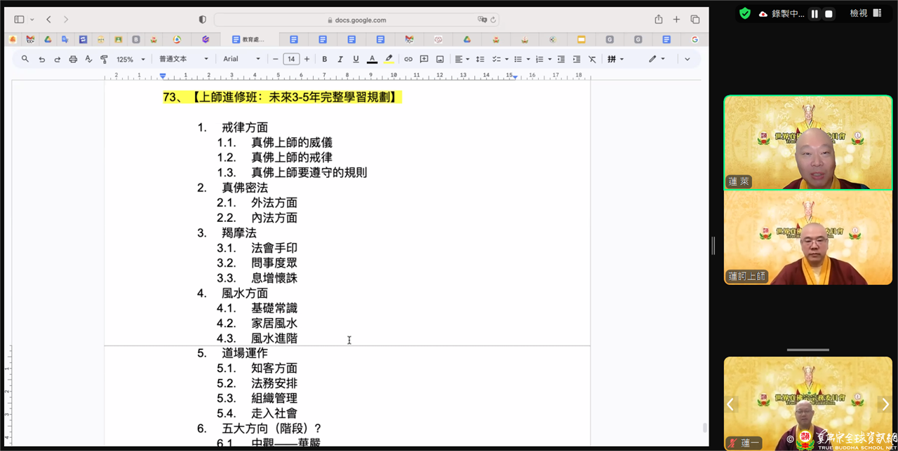 接著蓮訶上師亦報告教育處已擬定未來3~5年上師進修課程規劃,含括戒律(威儀、戒律、應遵守的規則)、真佛密法(含外法、內法)、羯摩法(含手印、問事、息增懷誅)、風水(含基礎常識、家居風水、進階課程)、道場運作(含知客、法務安排、組織管理、走入社會)、五大學習方向(含中觀、唯識、瑜珈、真如、般若;或華嚴、阿含、方等、般若、法華涅槃。)五部大論(俱舍論、現觀莊嚴論、入中論、釋量論、戒論)等內容。而眾所期待的梵唄實體課程,已於各個國家安排好授課老師。