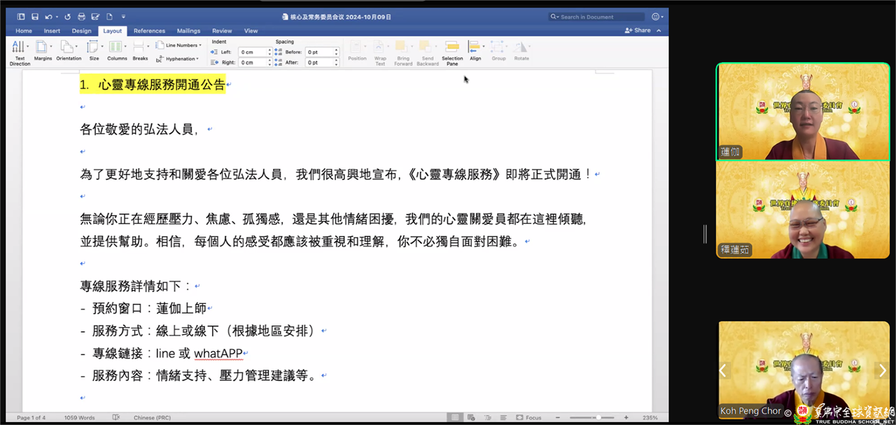 西雅圖時間2024年10月10日,假雲端ZOOM會議室,舉行第六屆核心小組暨常務委員第七次會議。在每一季召開一次與常務委員會議,俾讓常務委員們一起跟進宗務發展討論計畫,本次出席人員共有20位。