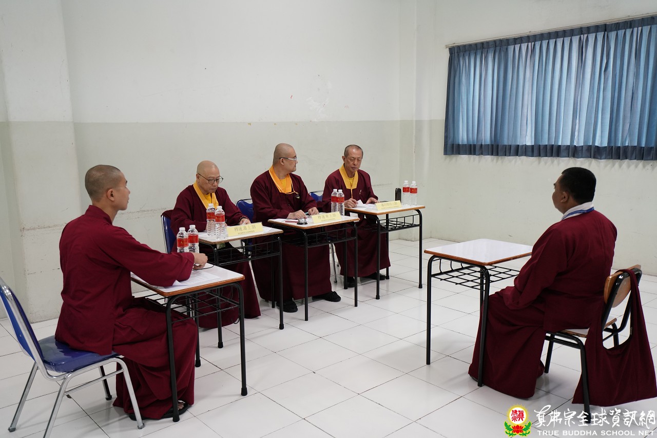 6月26日上午是筆試,講師助教在同一間考場作答,當然試卷不同。下午的面試及梵唄,則在敬德學校的教室舉行。一共借用了6間高中生的教室作為考場,其中一間是考生等待室,兩間作為梵唄考場,三間用來面試,每間考場有三位上師。考講師的先接受面試,考助教的五人一組先考梵唄。考試期間嚴禁交談,大家都能遵守規則。這場考試一直進行到下午五點才全部結束。晚餐後宗委會上師們和密總,總協,及印尼上師召開一次工作會議,直到晚上九點半過後,才回去休息。