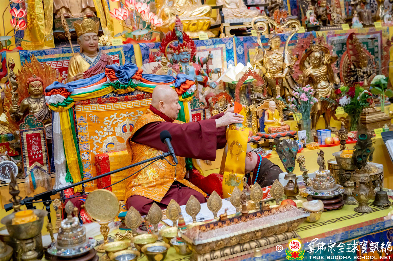 在講解完維摩詰經後,聖尊為求皈依的信眾賜授皈依灌頂,並加持大悲咒水、開光佛像,最後持拂塵一一加持與會大眾,同修吉祥圓滿。