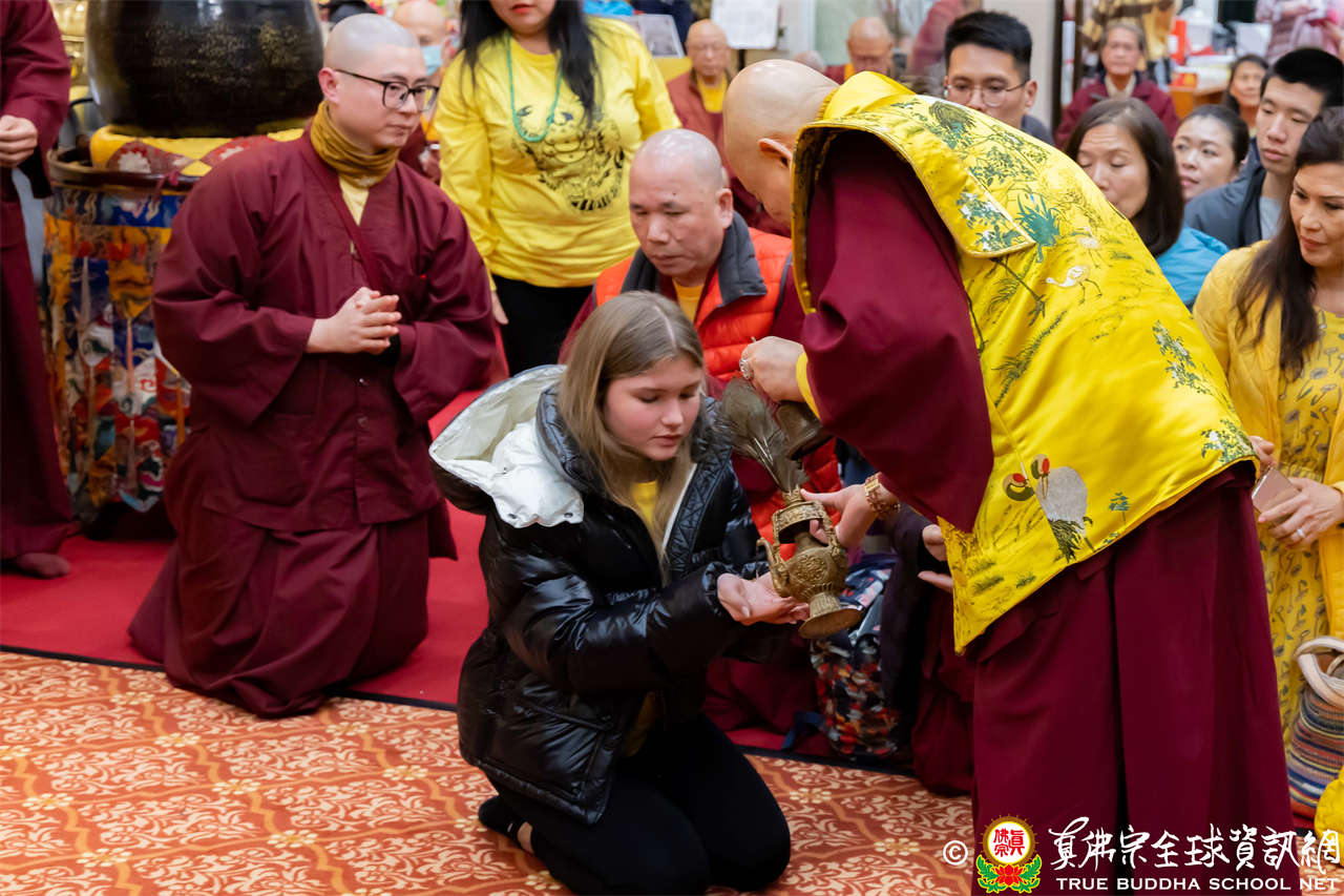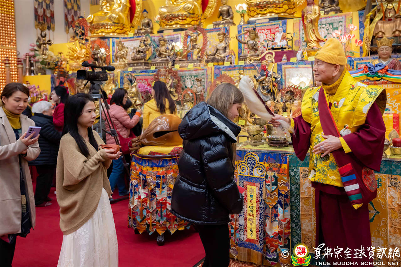 聖尊精彩奧妙的講經開示結束後,慈悲為諸求皈依者授予皈依灌頂,並加持與會大眾、加持大悲咒水及開光佛像,最後再持拂塵一一摩頂加被與會所有善信大德。