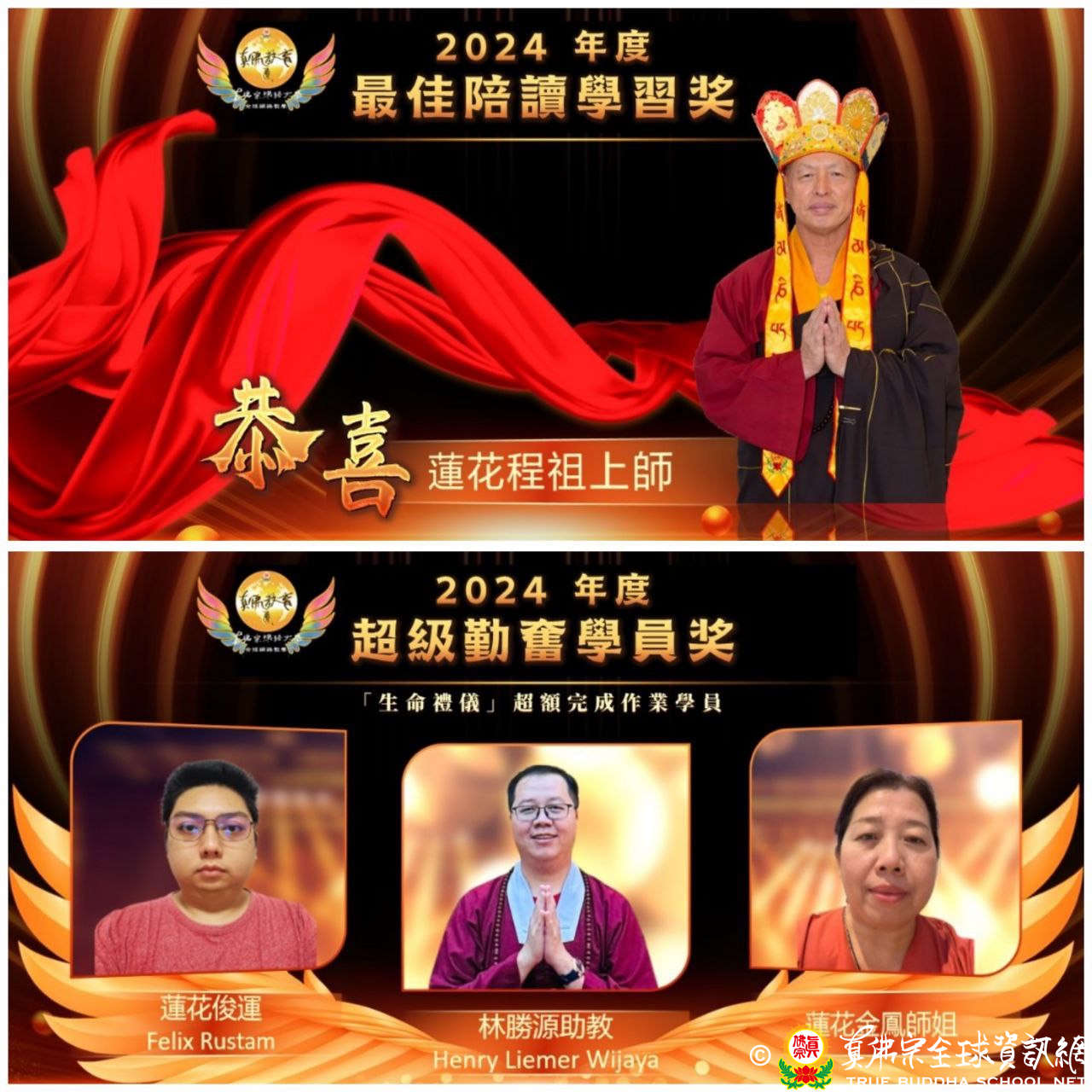 超級勤奮學員獎: Felix Rustam 蓮花俊運、Henry Liemer Wijaya林胜源助教、蓮花金鳳。這三位學員都繳交了36節課的心得報告。