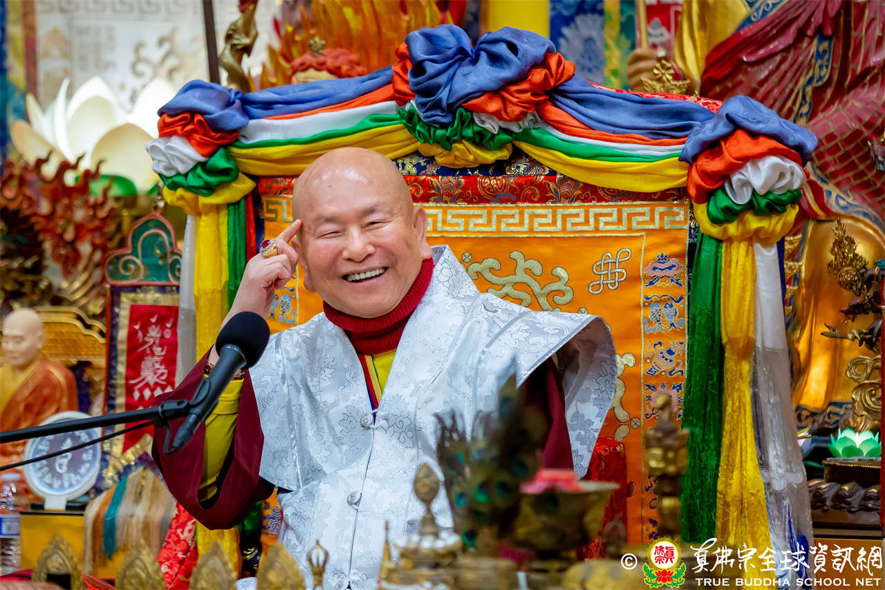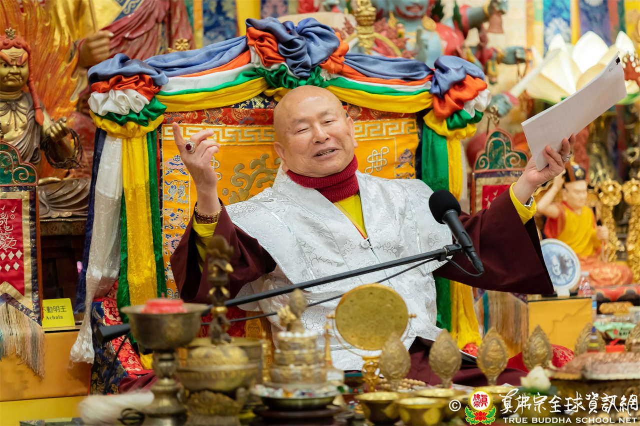 接著,聖尊告訴大眾,即將到來的新春法會,是很特殊的一個法會,我們一起向藥王度母祈禱,比如說我唸一句,大家跟著我唸一句,大家一起向藥王度母祈禱,希望祂遍灑甘露給我們,這個甘露能夠治所有的疑難雜症跟百病。