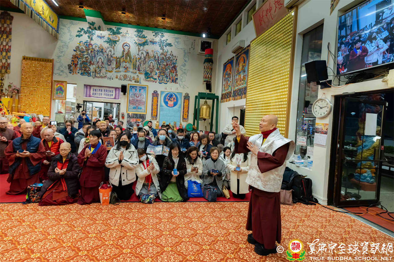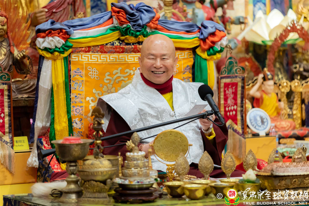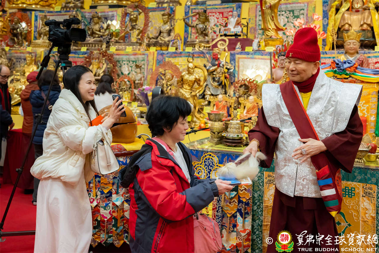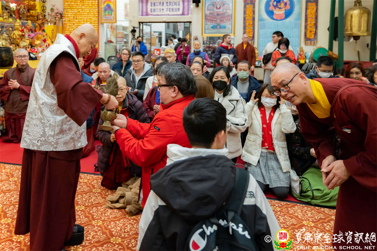 在寶貴的法語開示之後,聖尊為新皈依者進行皈依灌頂,加持佛像、供品以及大悲咒水,並以拂塵加持與會大眾,人人法喜充滿。