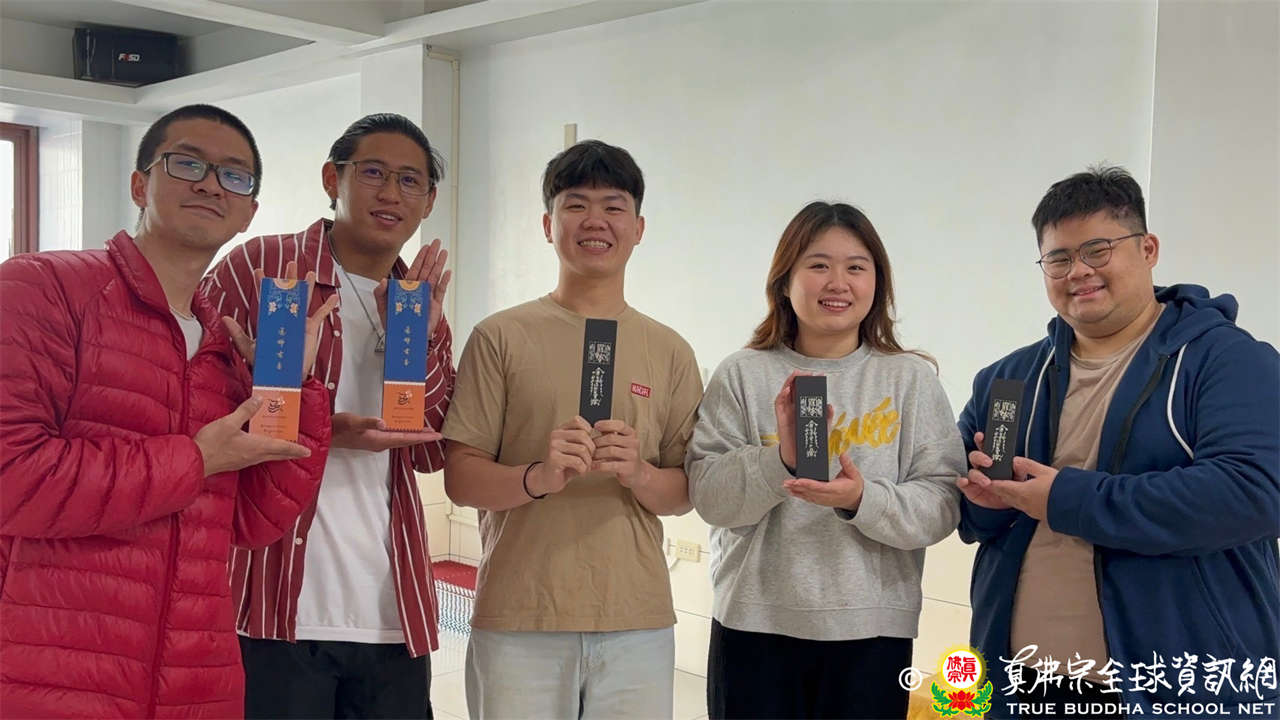 隨後堂主感謝青年發心幫忙宗務,對於大家的熱忱深受感動,遂與台灣真青會結緣 根本上師加持的智慧筆及西藏臥香,台灣真青會亦準備禮盒及供養,由堂主代表本師堂及蓮籍上師接受這份虔誠的心意。