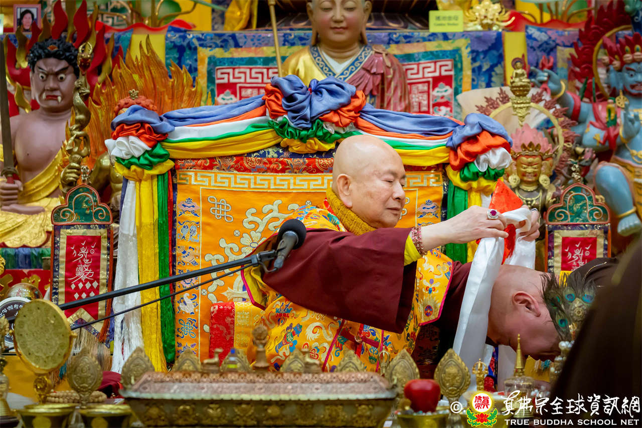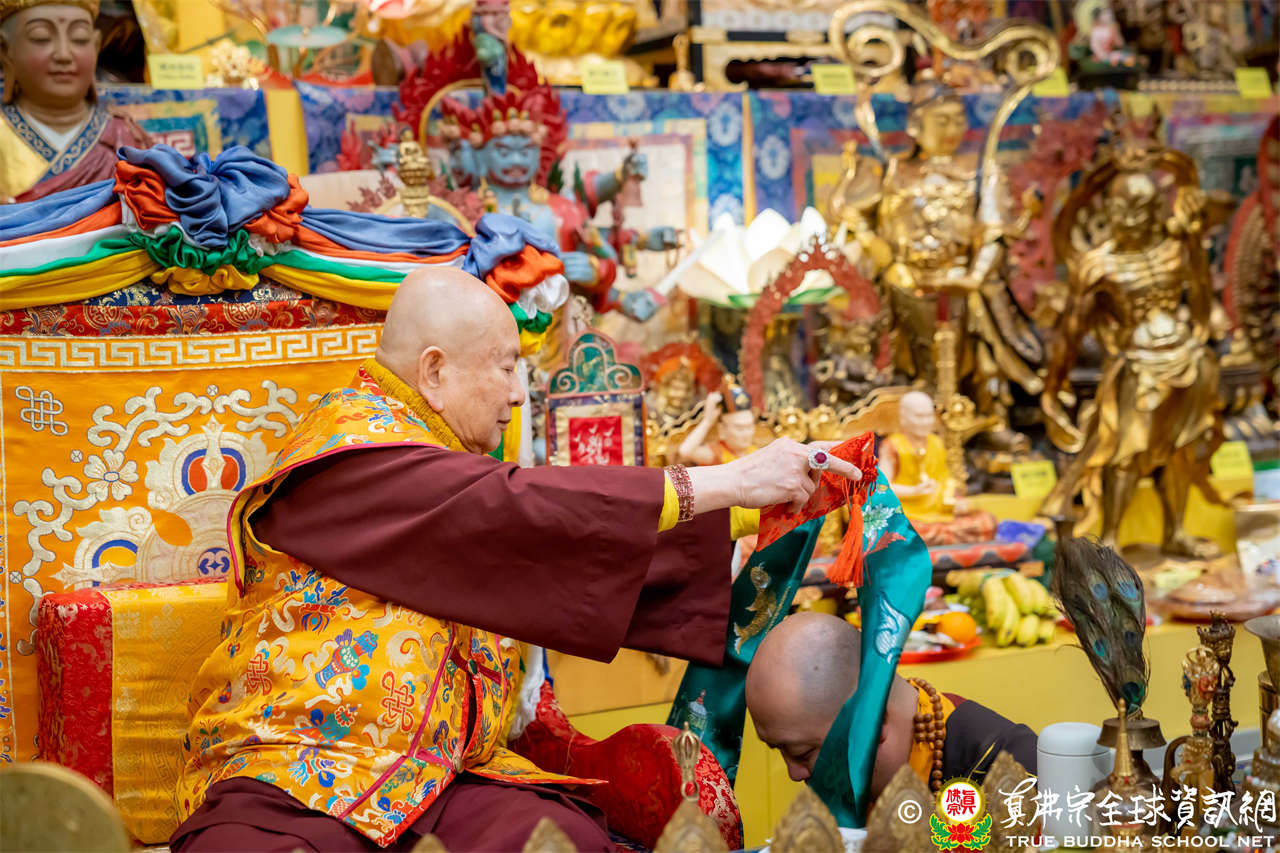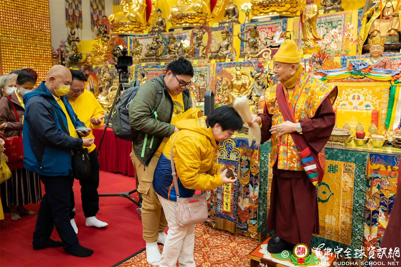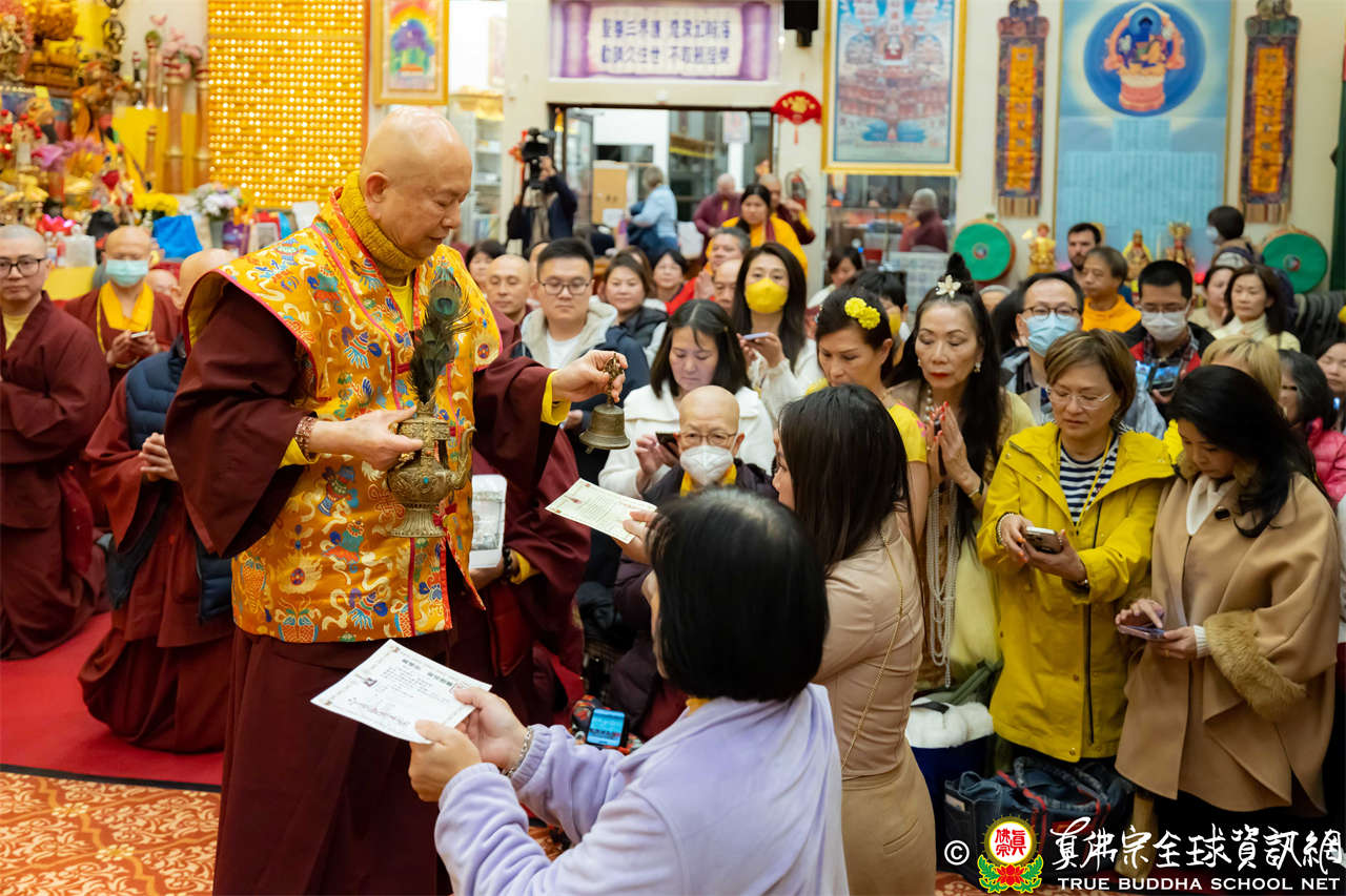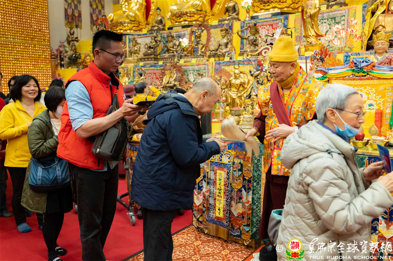 聖尊精彩寶貴的法語開示後,慈悲為新皈依弟子做皈依灌頂,然後加持大悲咒水、開光佛像,最後持拂塵一一加持與會大眾。