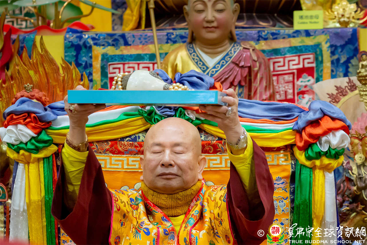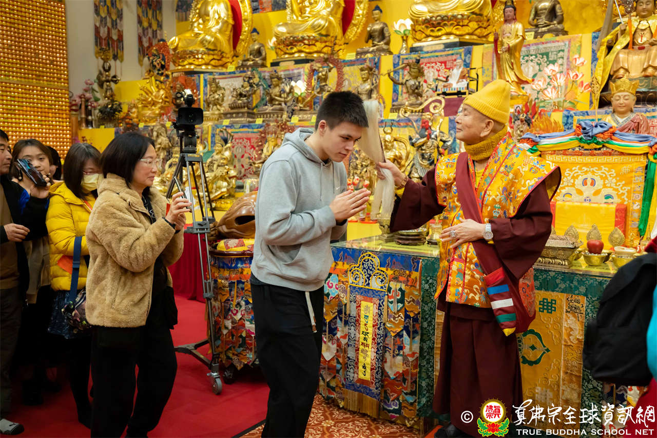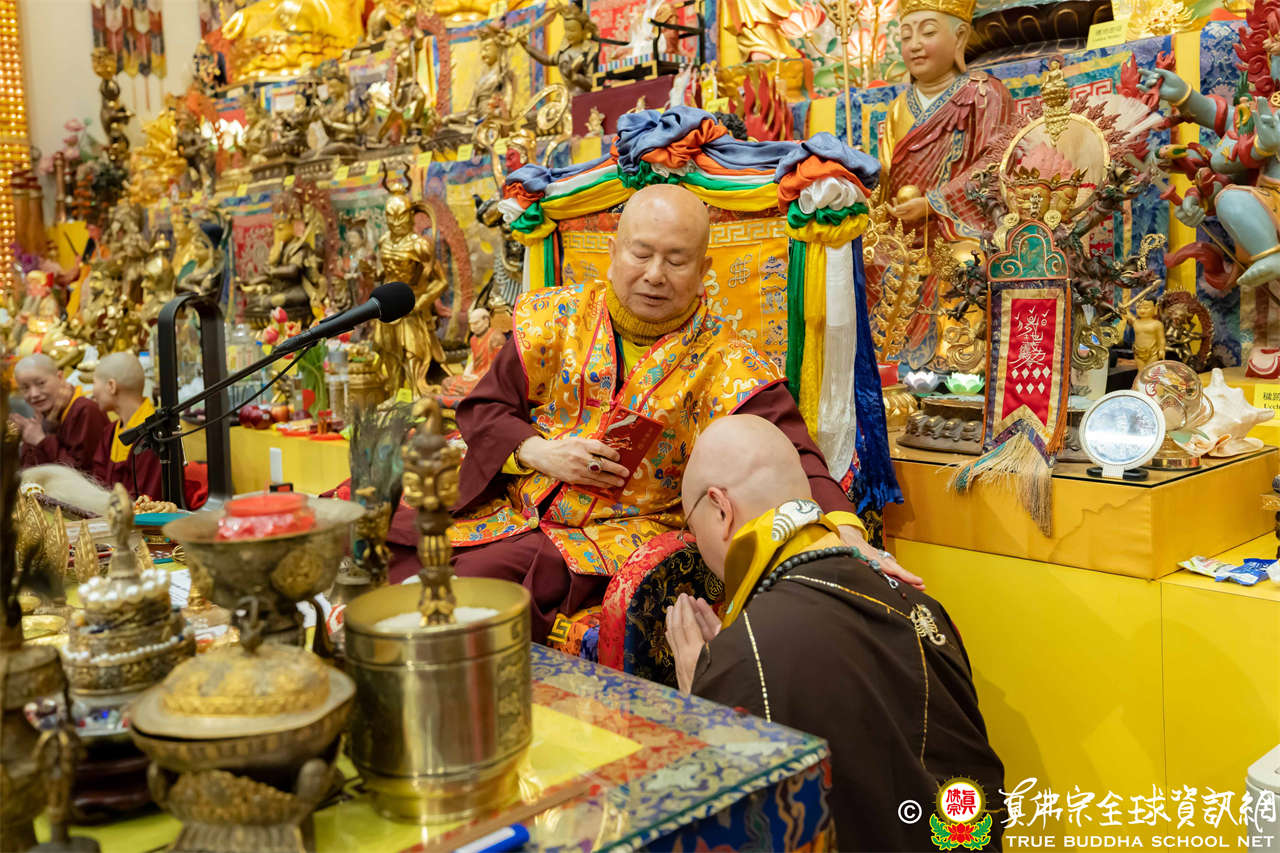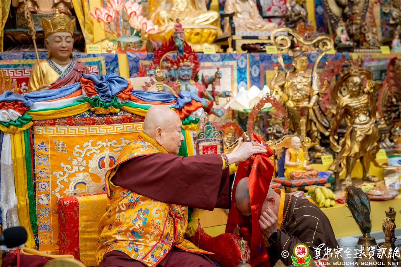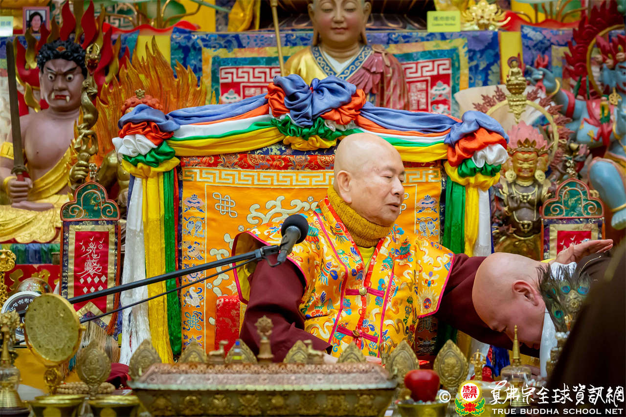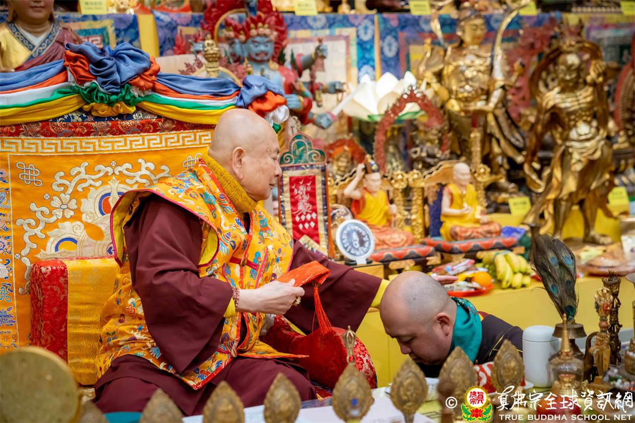 聖尊精彩寶貴的法語開示後,慈悲為新皈依弟子做皈依灌頂,然後加持大悲咒水、開光佛像,最後持拂塵一一加持與會大眾。