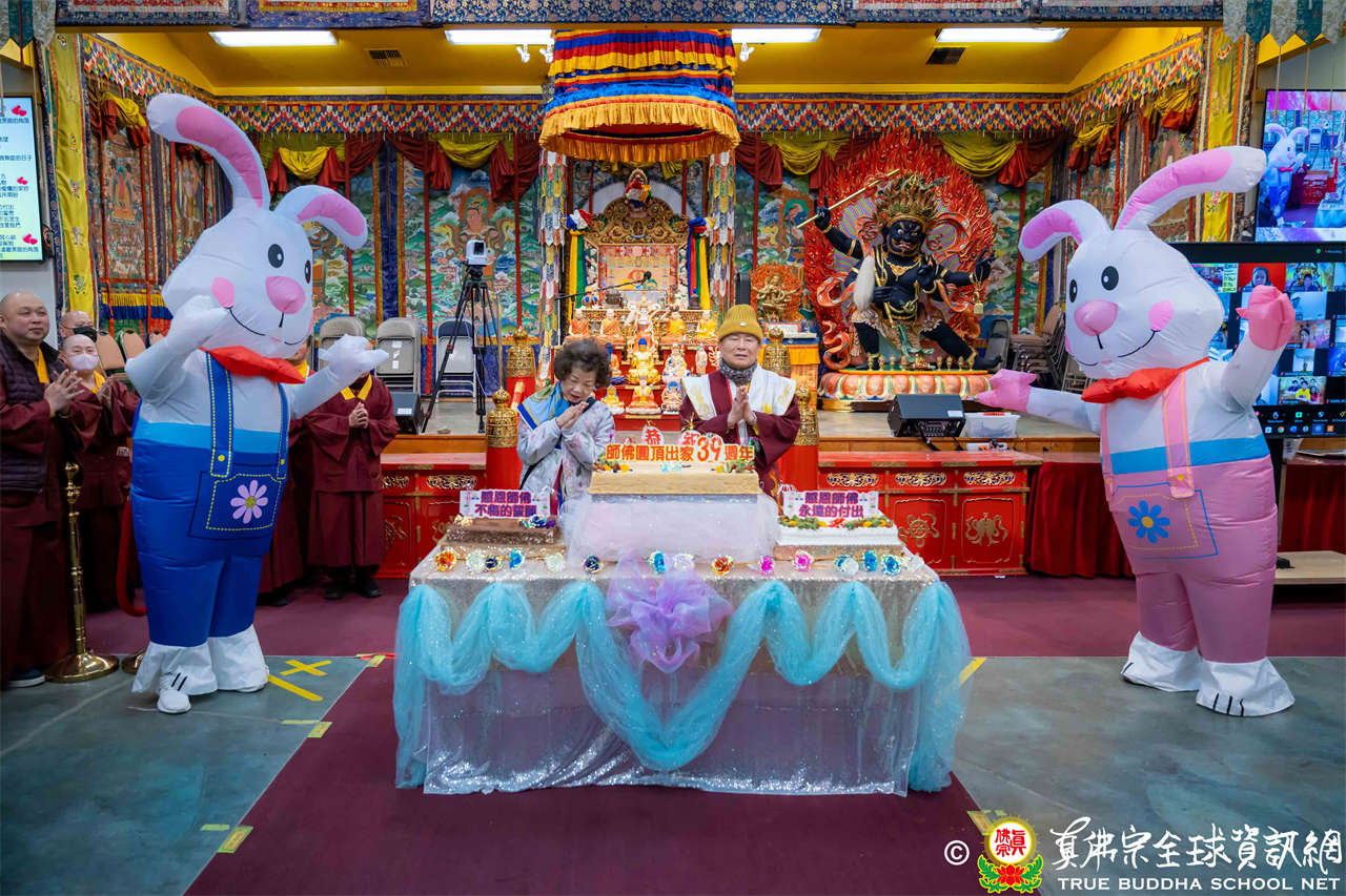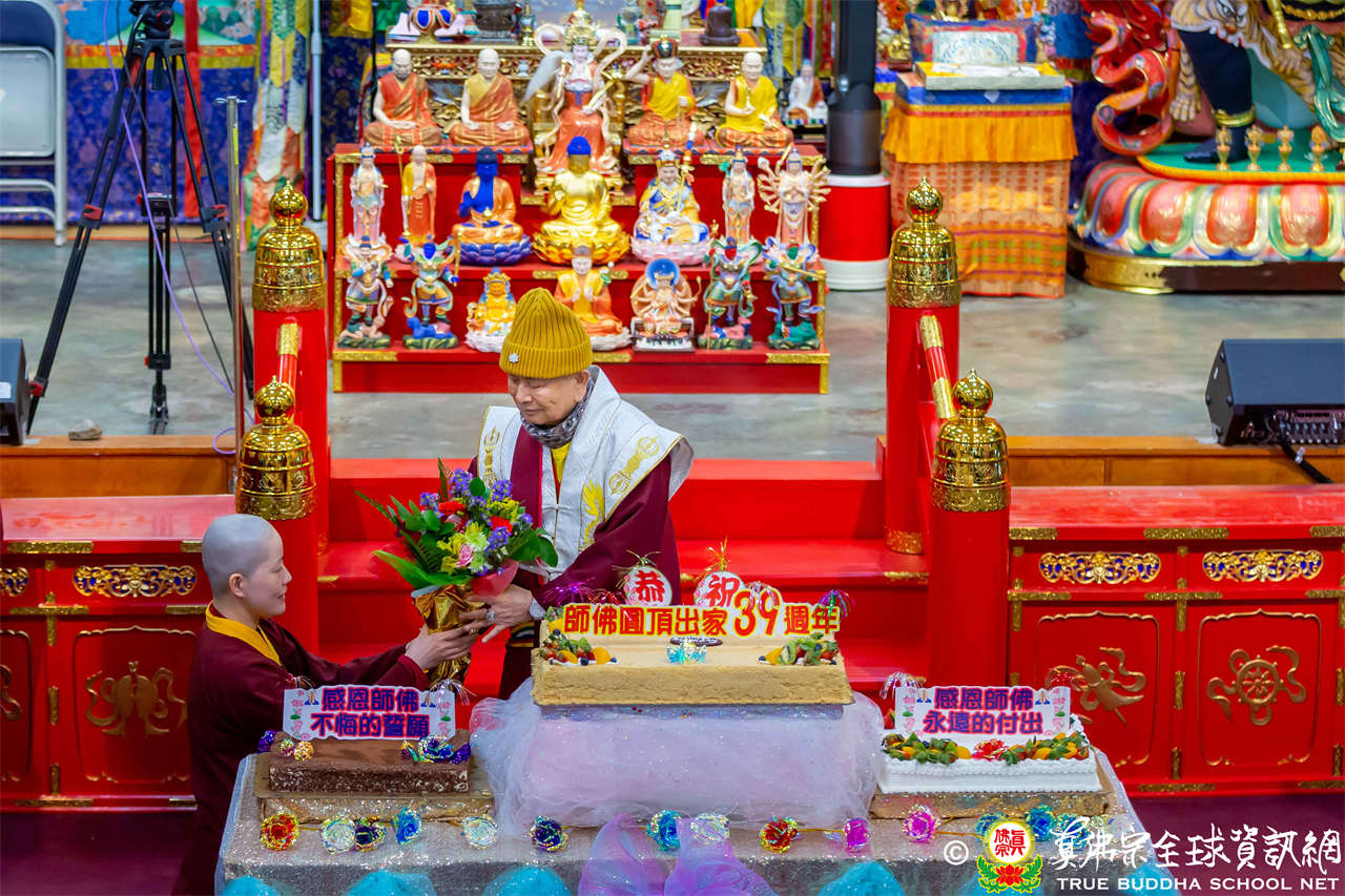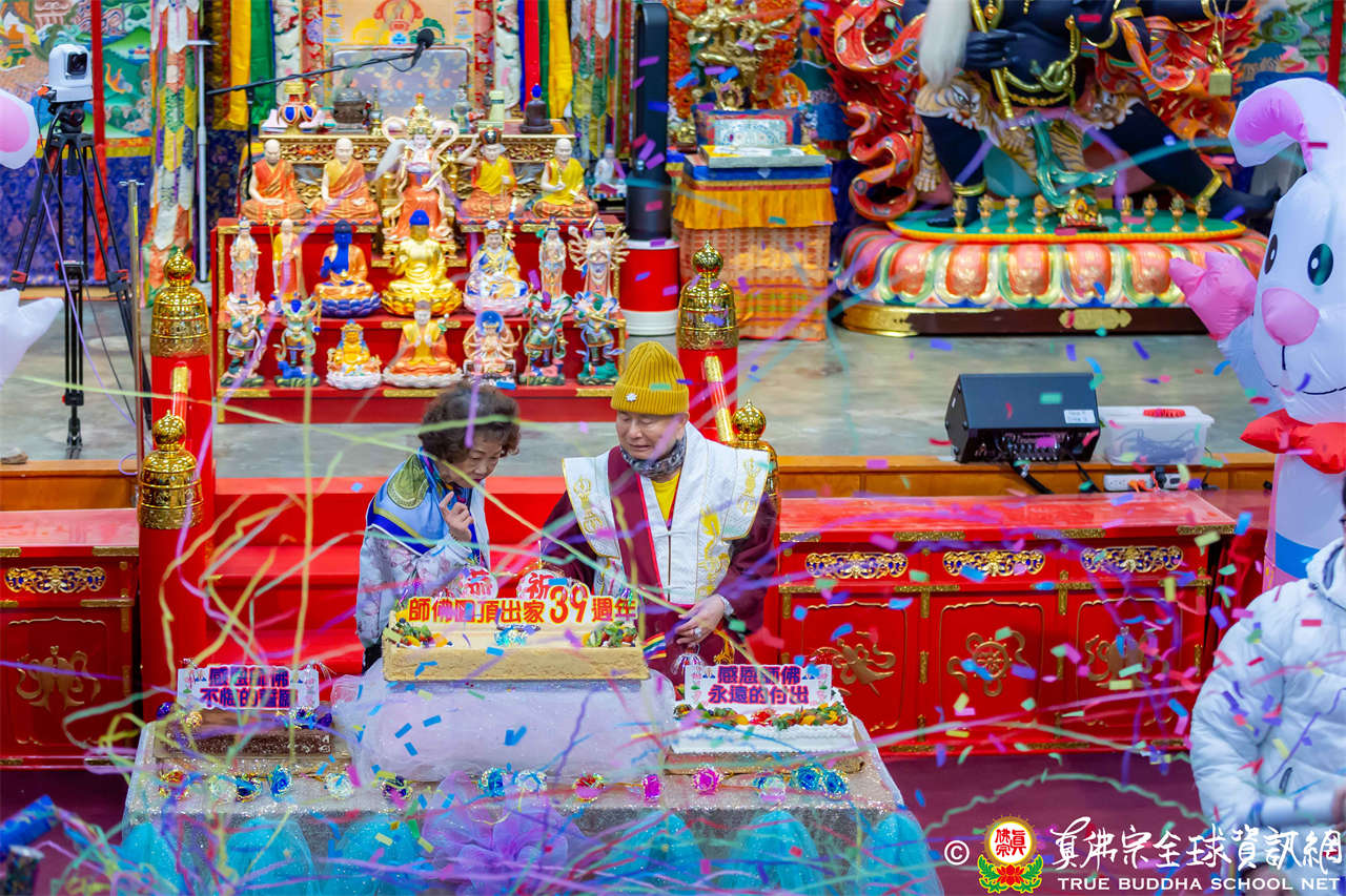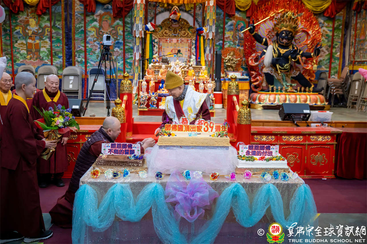2025年3月9日,西雅圖彩虹雷藏寺恭請聖尊蓮生法王主壇蓮花童子護摩法會。當天適逢農曆二月初十,亦是法王出家39週年的紀念日。護摩儀式結束後,現場播放由宗委會製作的出家39年紀念影片,隨後,法王更即興唱起印尼文生日歌,為這特別的日子增添歡樂氛圍。