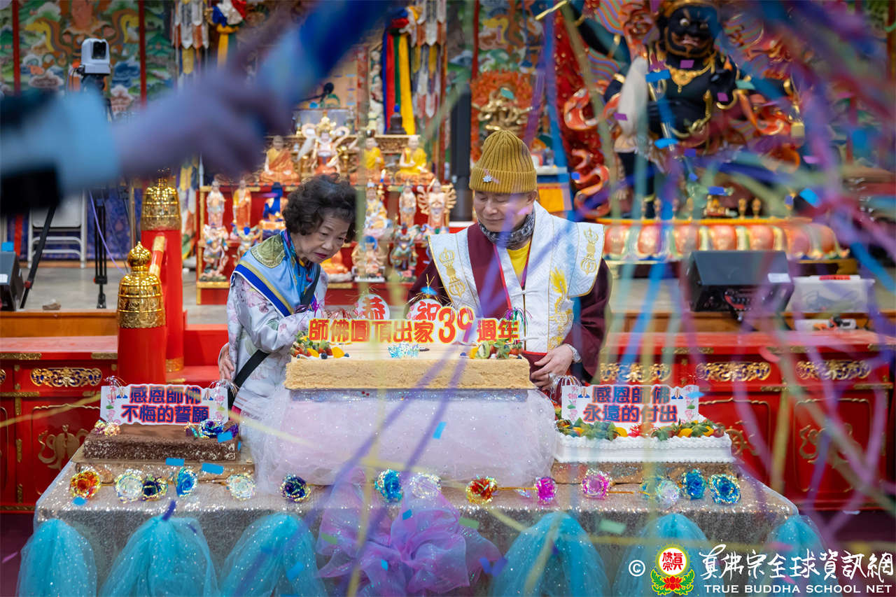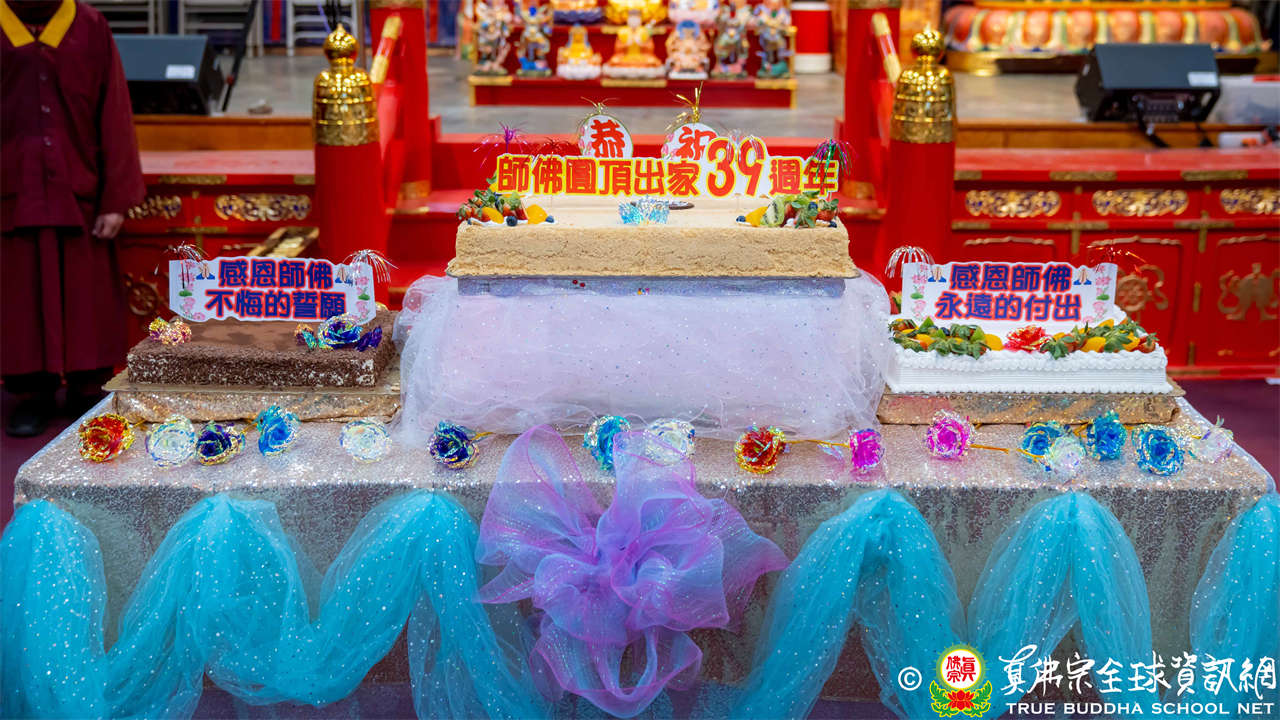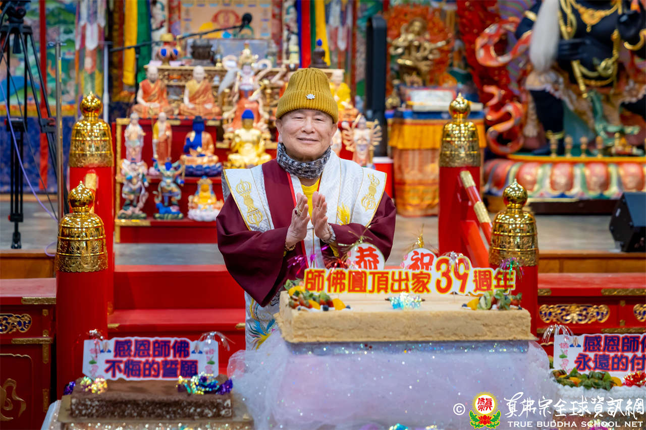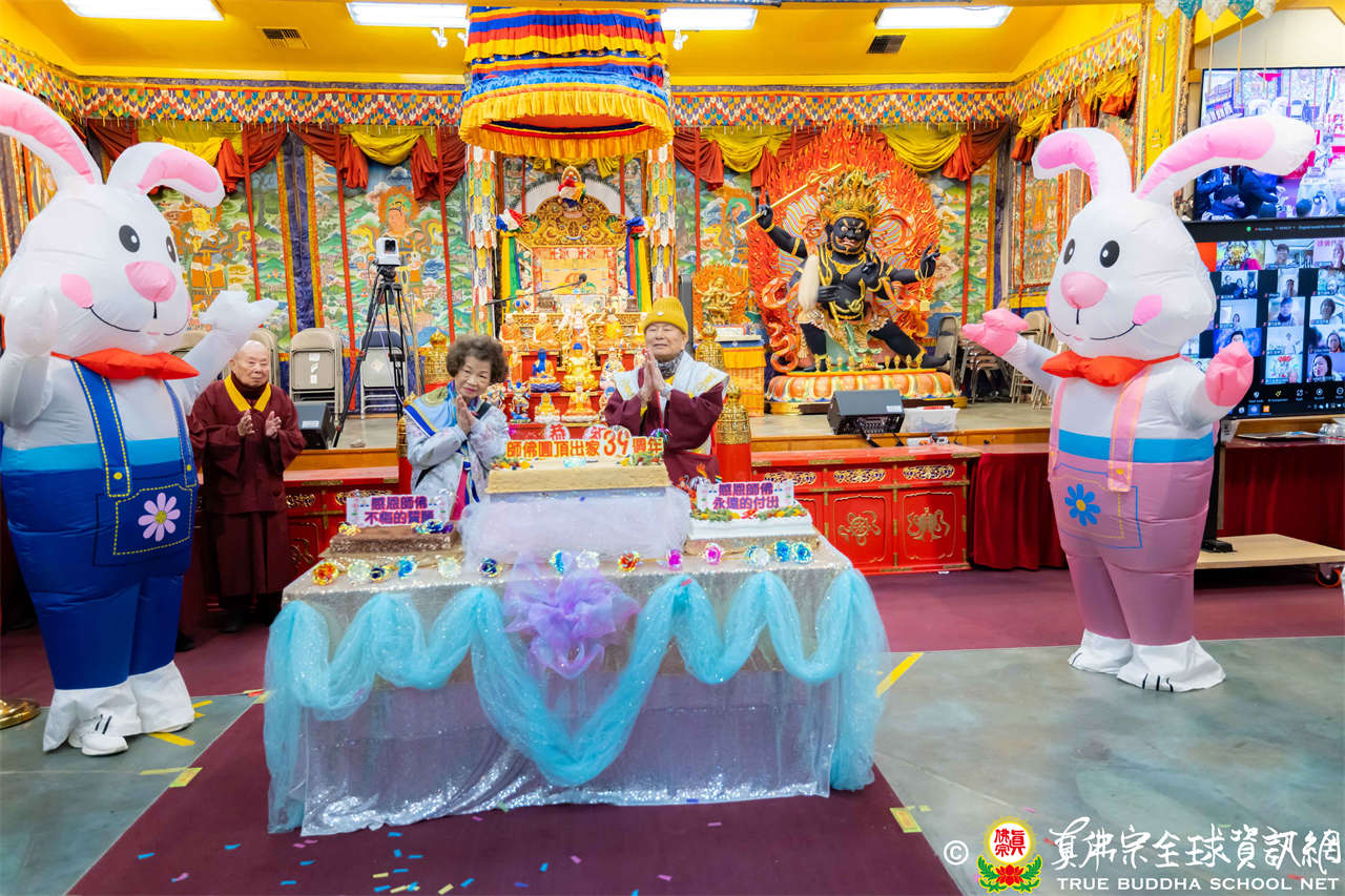 2025年3月9日,西雅圖彩虹雷藏寺恭請聖尊蓮生法王主壇蓮花童子護摩法會。當天適逢農曆二月初十,亦是法王出家39週年的紀念日。護摩儀式結束後,現場播放由宗委會製作的出家39年紀念影片,隨後,法王更即興唱起印尼文生日歌,為這特別的日子增添歡樂氛圍。