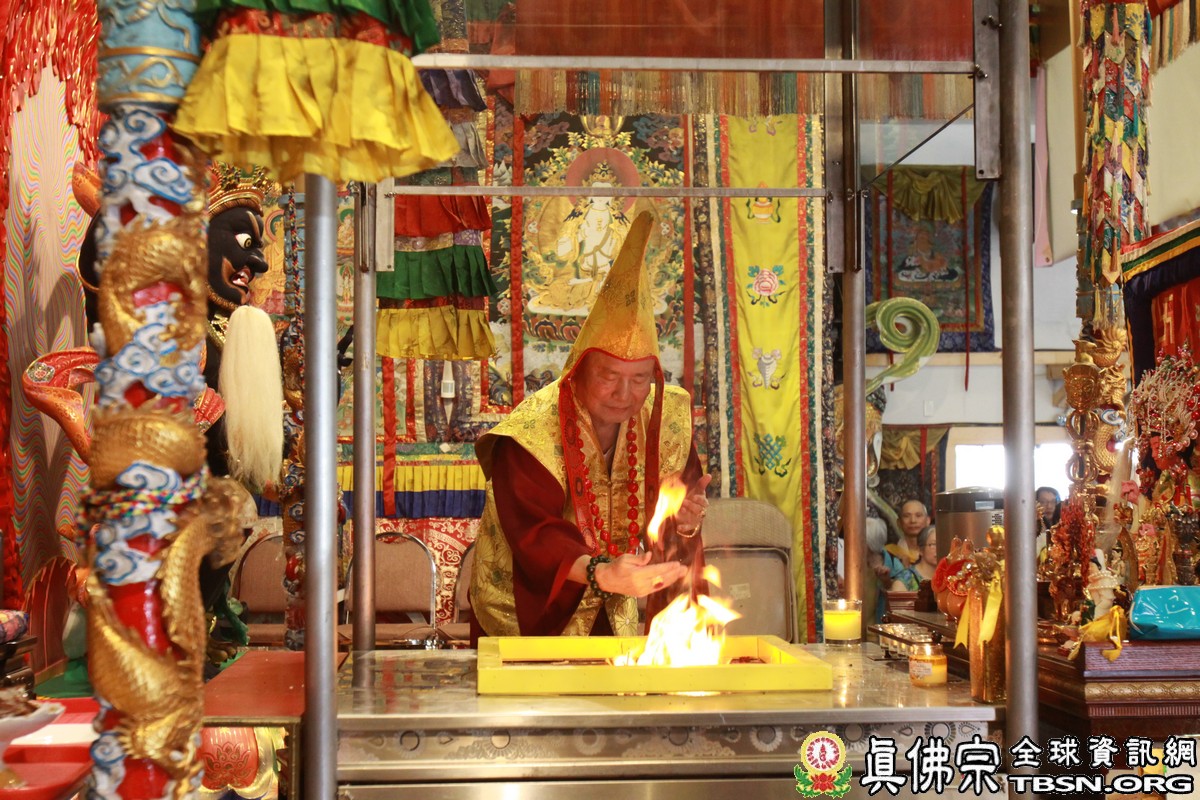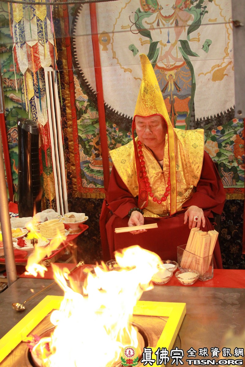 下午三時,法會正式開始,四眾弟子恭迎聖尊蓮生法王及上師團法駕護摩寶殿。法會進行期間,聖尊演化優美殊勝的手印,現場靈氣充滿,威力曼妙的「嗡。金母悉地。吽。」咒音,響徹整個護摩殿;行者、火與本尊,三者融合為一,讓所有參加者在熊熊的護摩火焰中,淨化一切身心的業障。