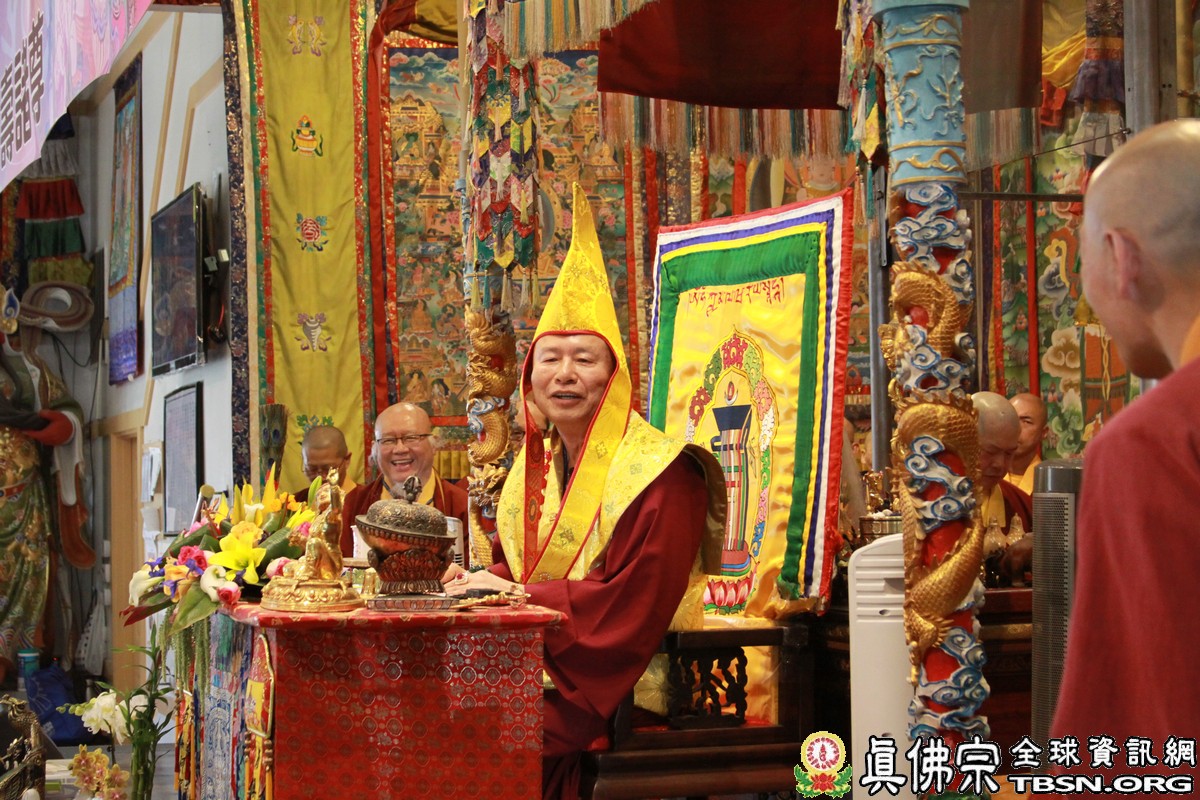 是日,護摩寶殿一大早就座無虛席,廖東周大使伉儷也出席參加,中午12點,四眾弟子熱情溫馨地恭迎法王聖尊進入大飯店共進午餐,此次的午餐加洲四大媽特地在用餐時供養了很多的笑話,逗得師尊及大家樂開懷,笑聲連連。
