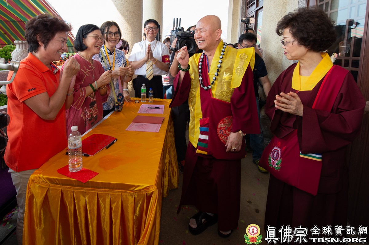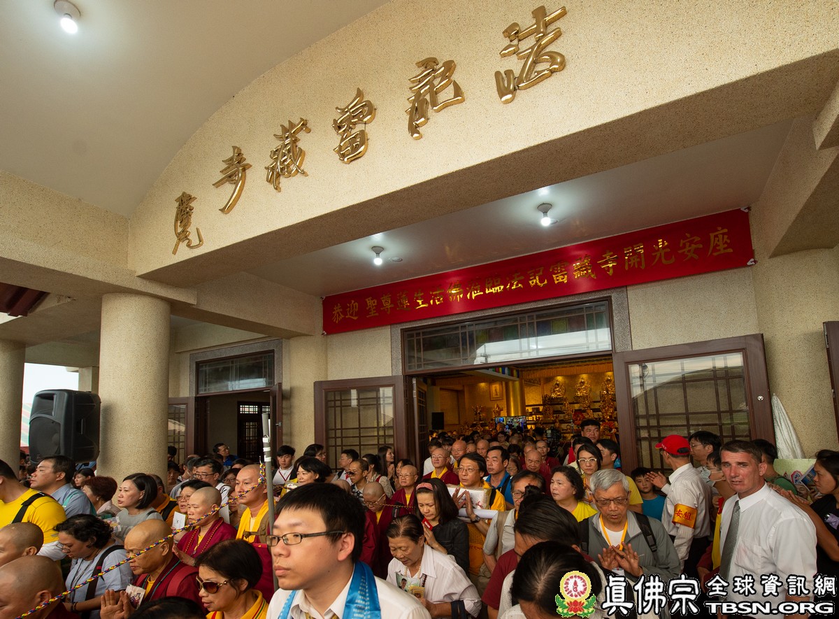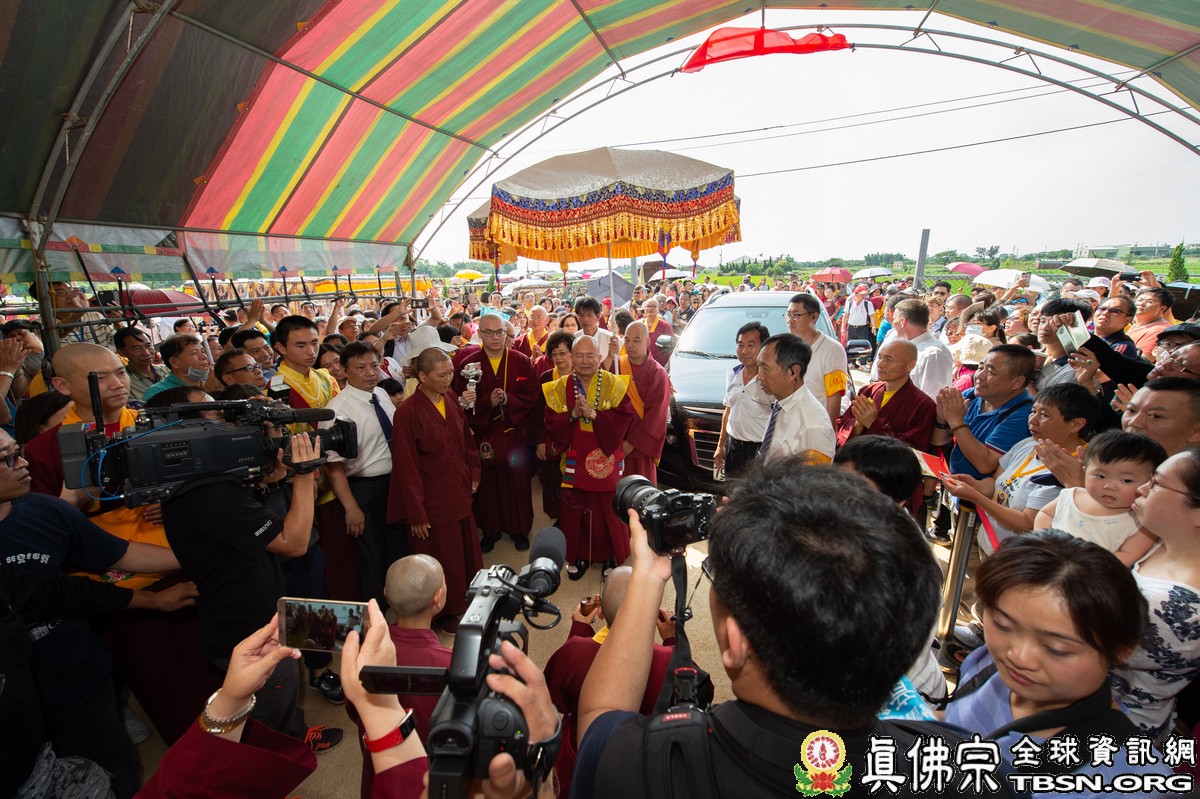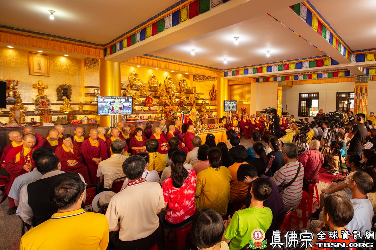 法王到達法記雷藏寺後,即為雷藏寺主持剪綵典禮及作灑淨結界,賜墨寶和慈悲接受600多位主祈者敬獻哈達,並替法記雷藏寺壇城開光。