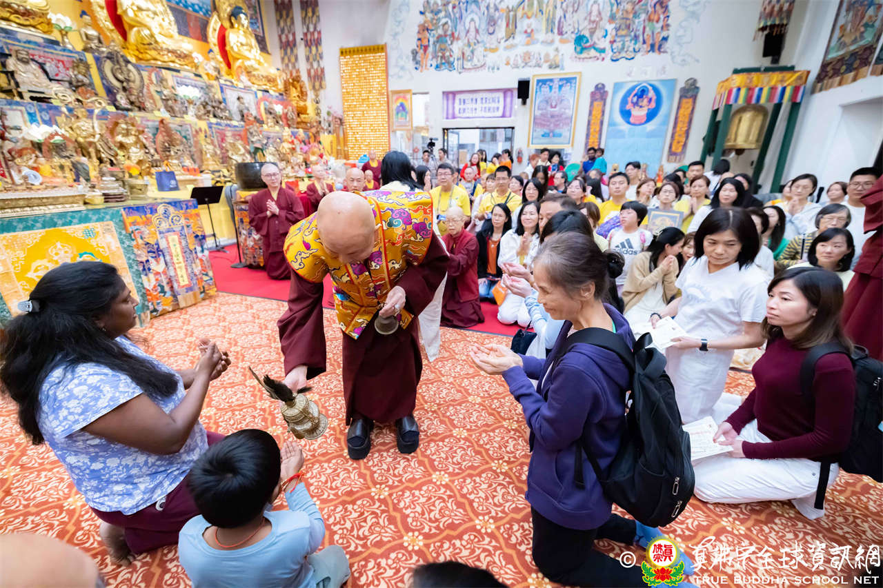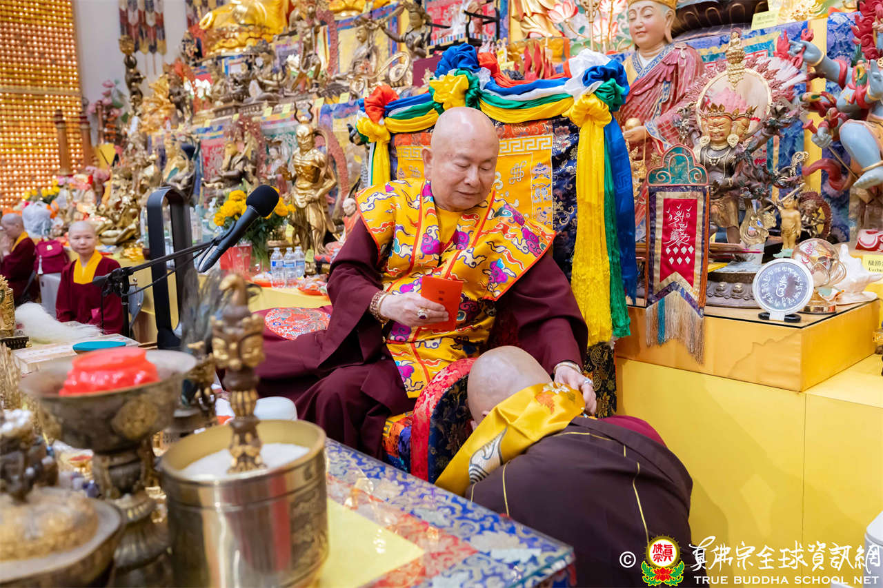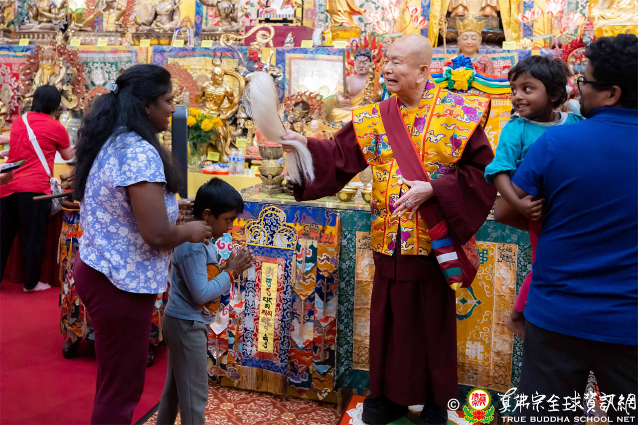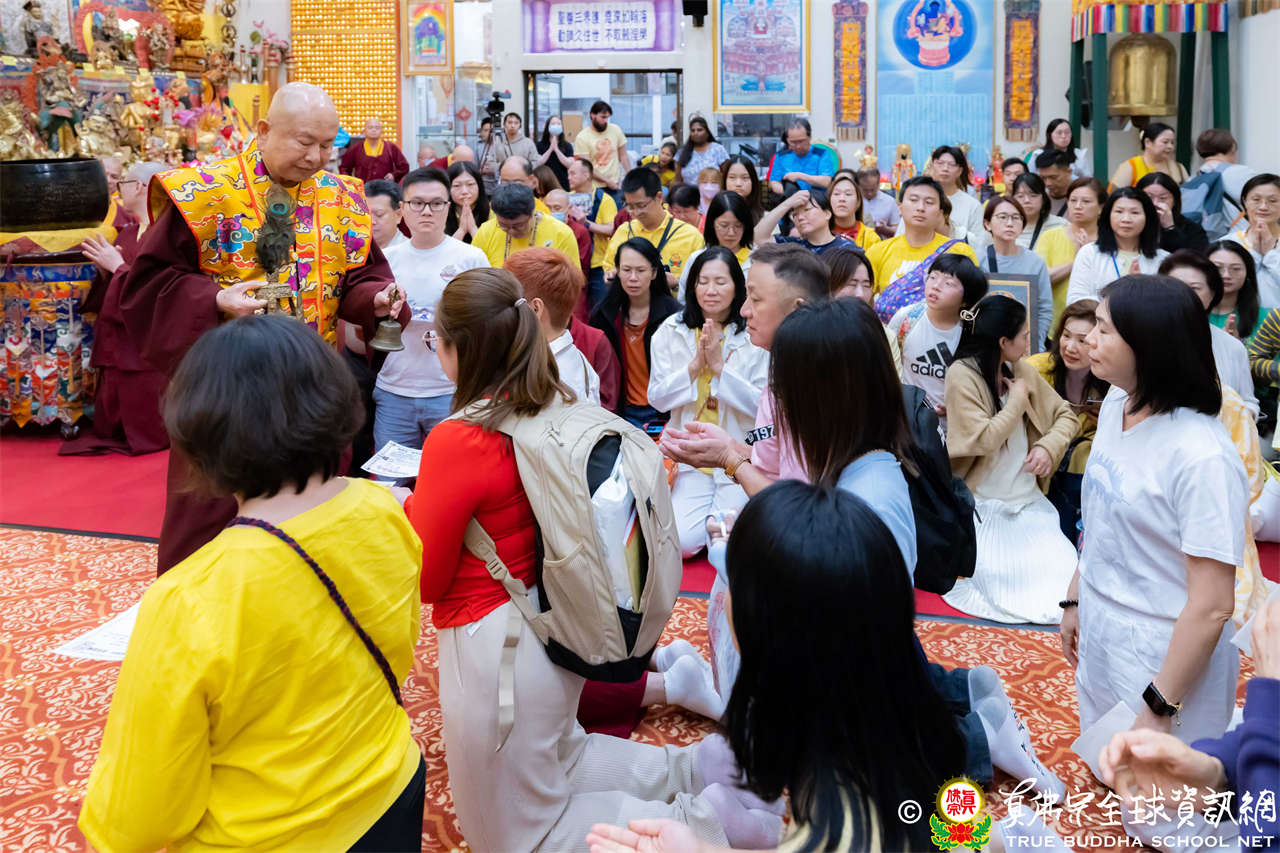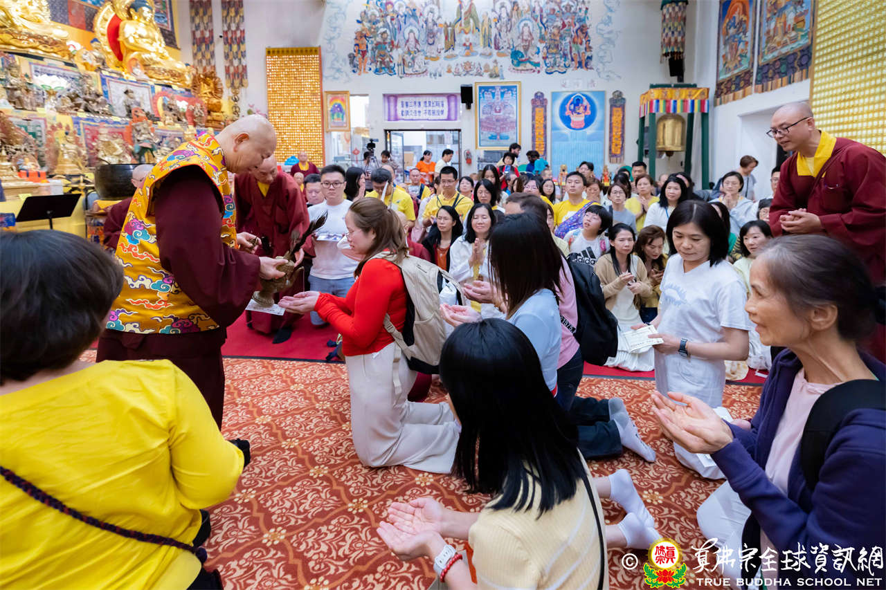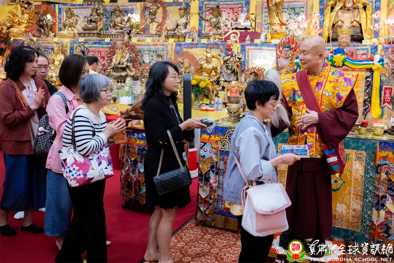 開示結束後,聖尊為新皈依弟子做皈依灌頂,並開光佛像、加持佛具部,最後持拂塵一一加持與會大眾。