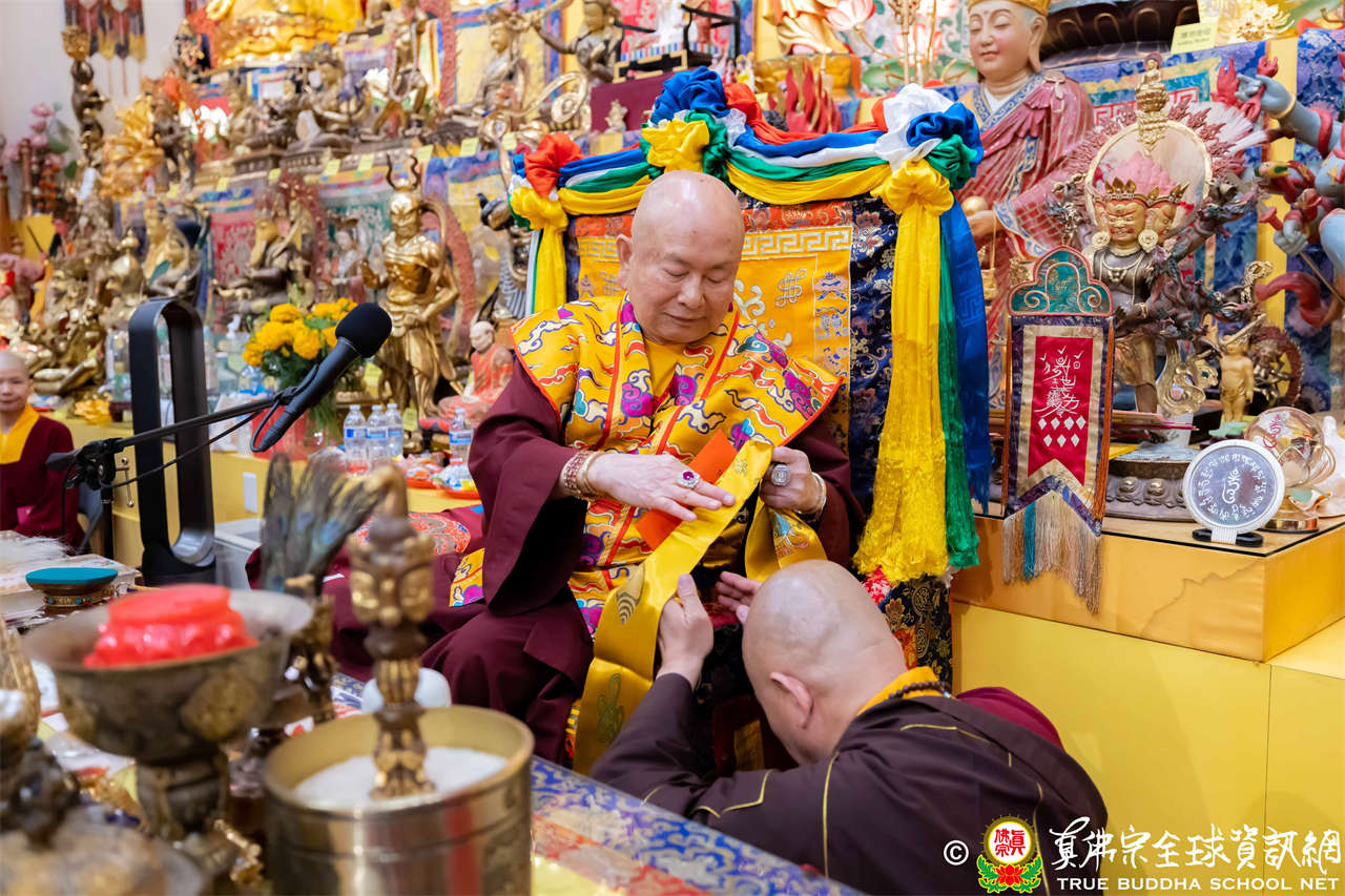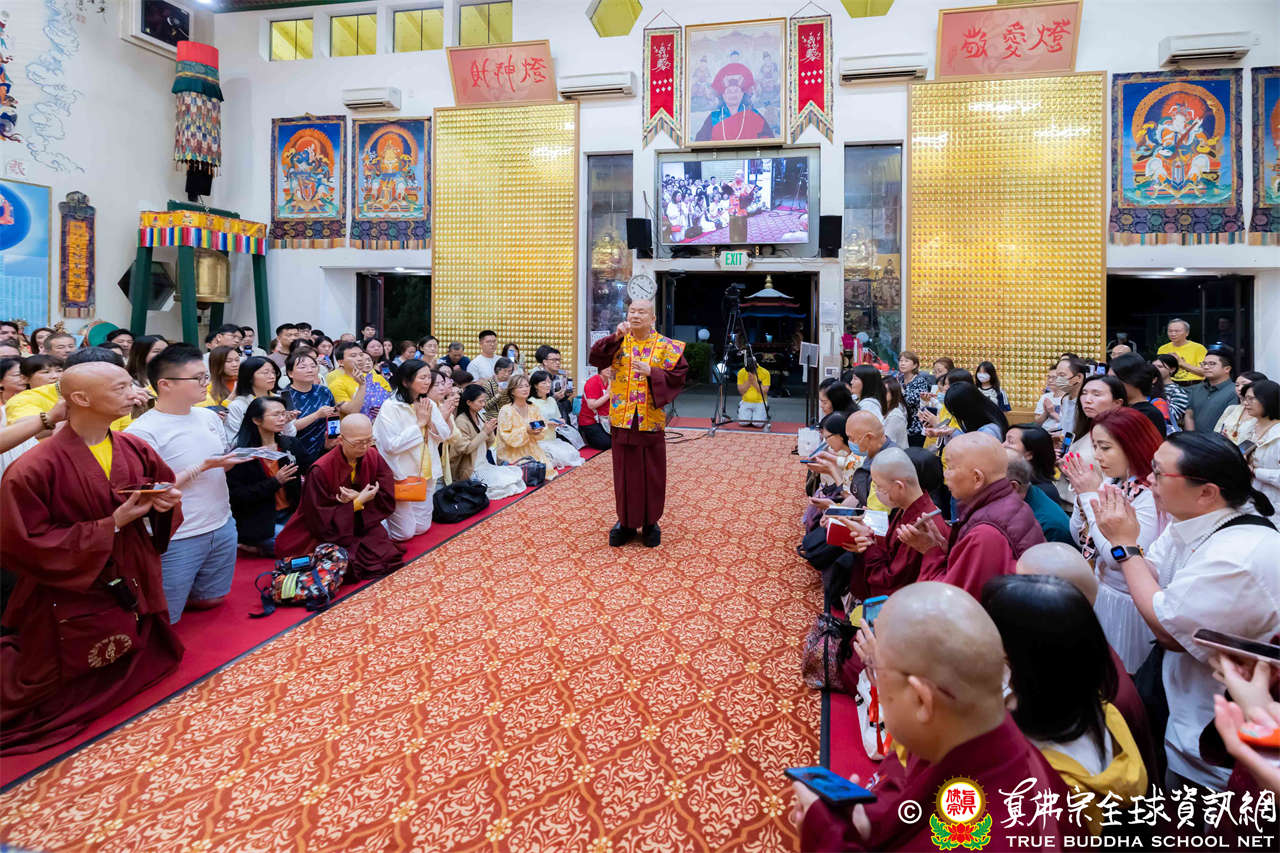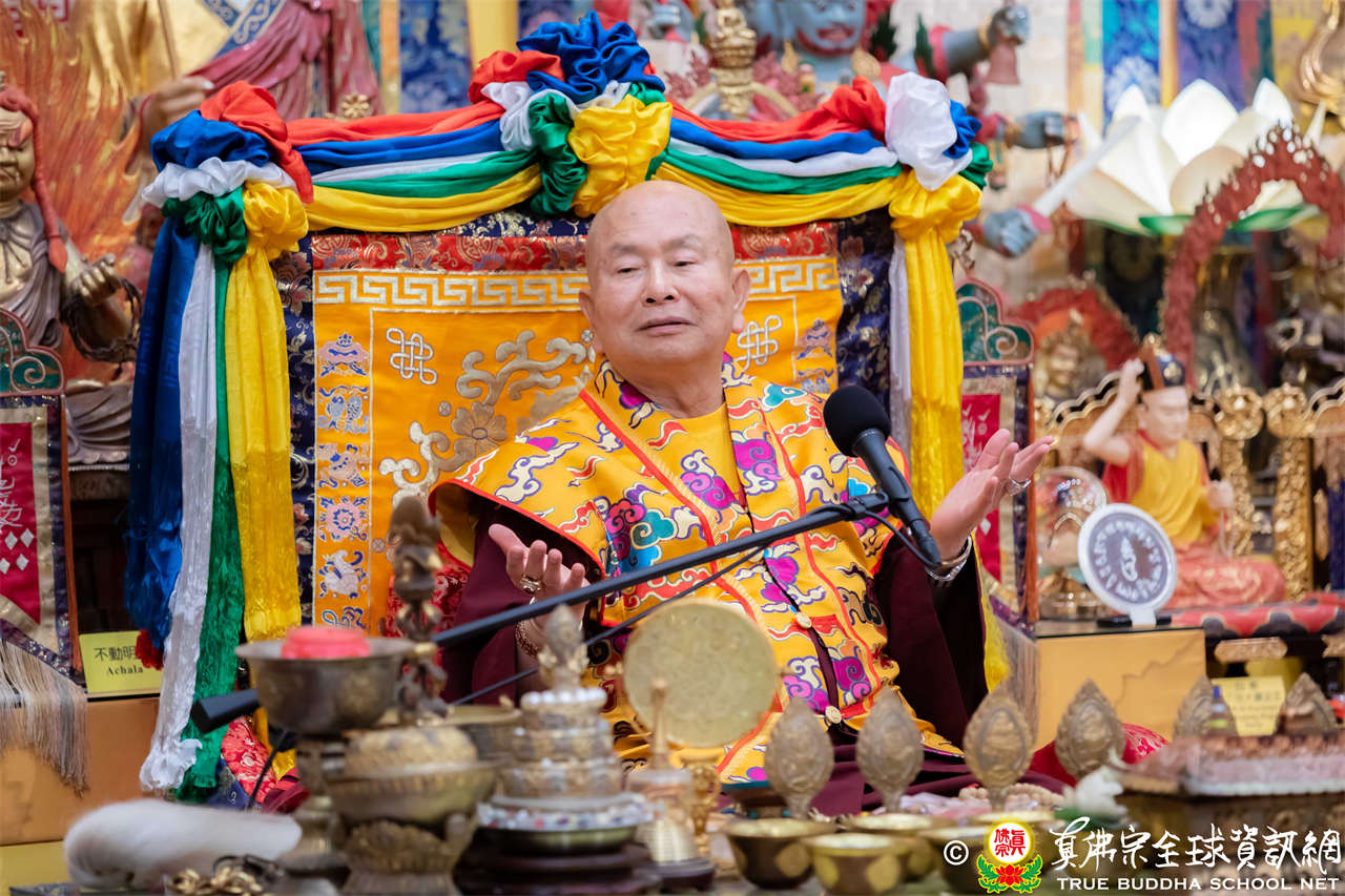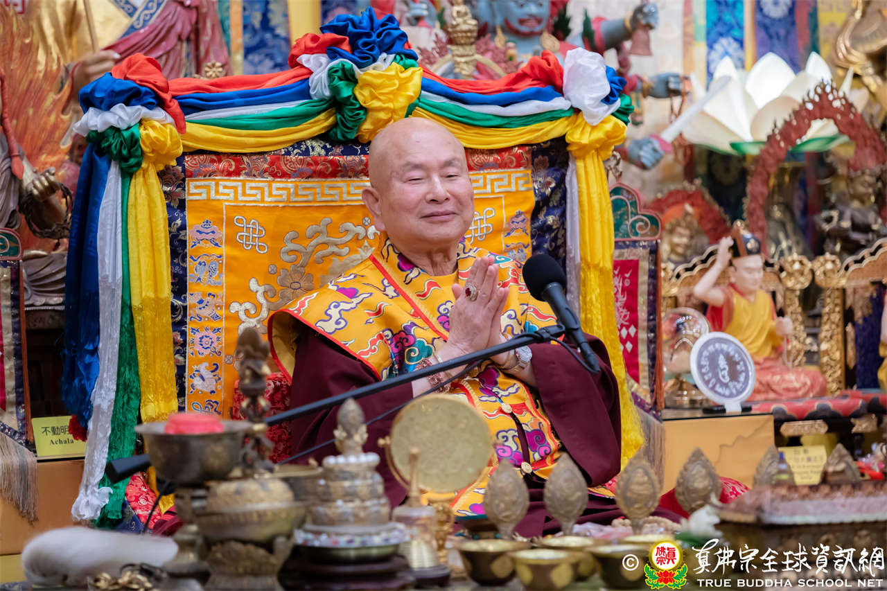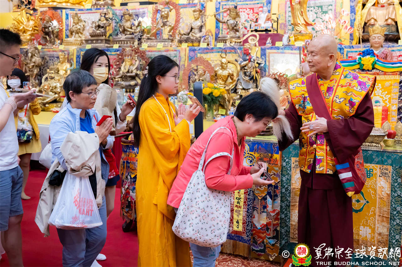 開示結束後,聖尊為新皈依弟子做皈依灌頂,並開光佛像、加持佛具部,最後持拂塵一一加持與會大眾。