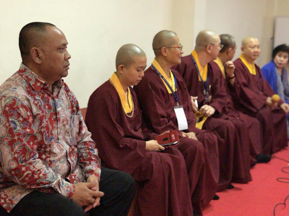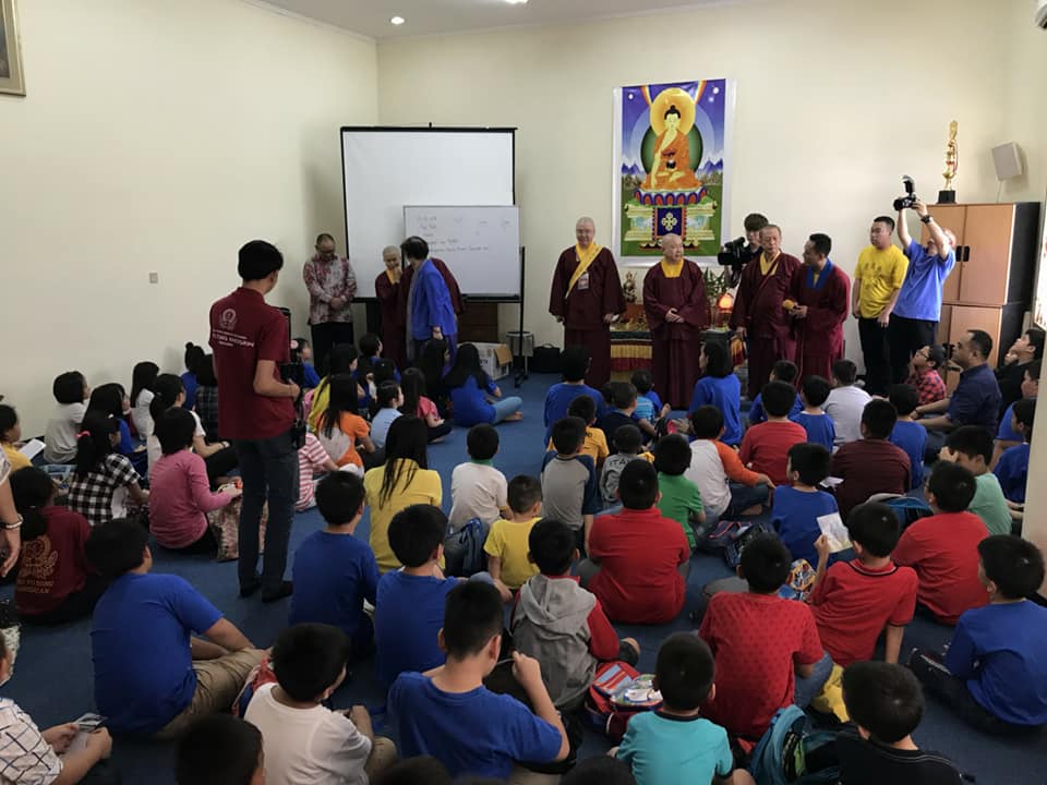 【TBSN報導】 2018年3月25日,在法會前,會長蓮花程祖上師、教育處長蓮訶上師、文宣處長蓮悅上師在蓮飛上師的帶領下,來到印尼雷藏寺的二樓,參觀周日青少年佛學班與幼年佛學班。青少年班成員來自於敬德學校的初中與高中生,陪同參觀的還有印尼班登區宗教部佛教司長Triroso。