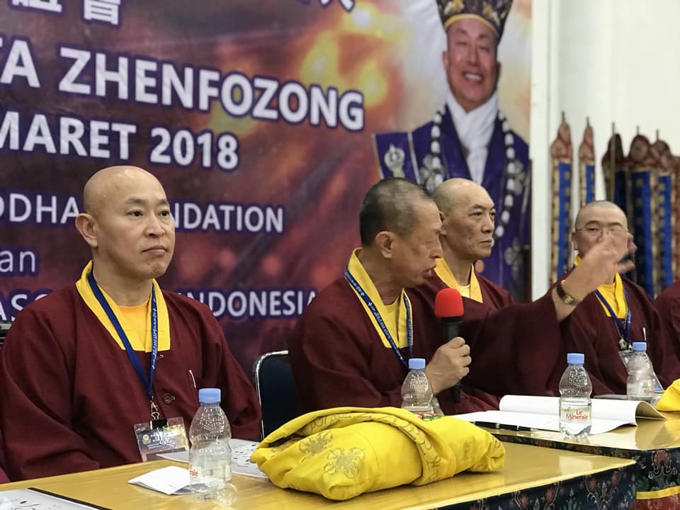 「其實在32年前,我就來到印尼,所以印尼也是我的家。當時基礎設施並不好,現在非常繁榮了,經濟水準提高,生活越來越好。我記得當時的雅加達河是黑色的,政府有能力後,進行過濾,現在河水已經比以前清澈。既然印尼國家可以改變,印尼真佛宗可以嗎?(眾呼:可以!)宗派要由你我一起來改變。硬體建設、基礎有了,我們要思考如何更好?」