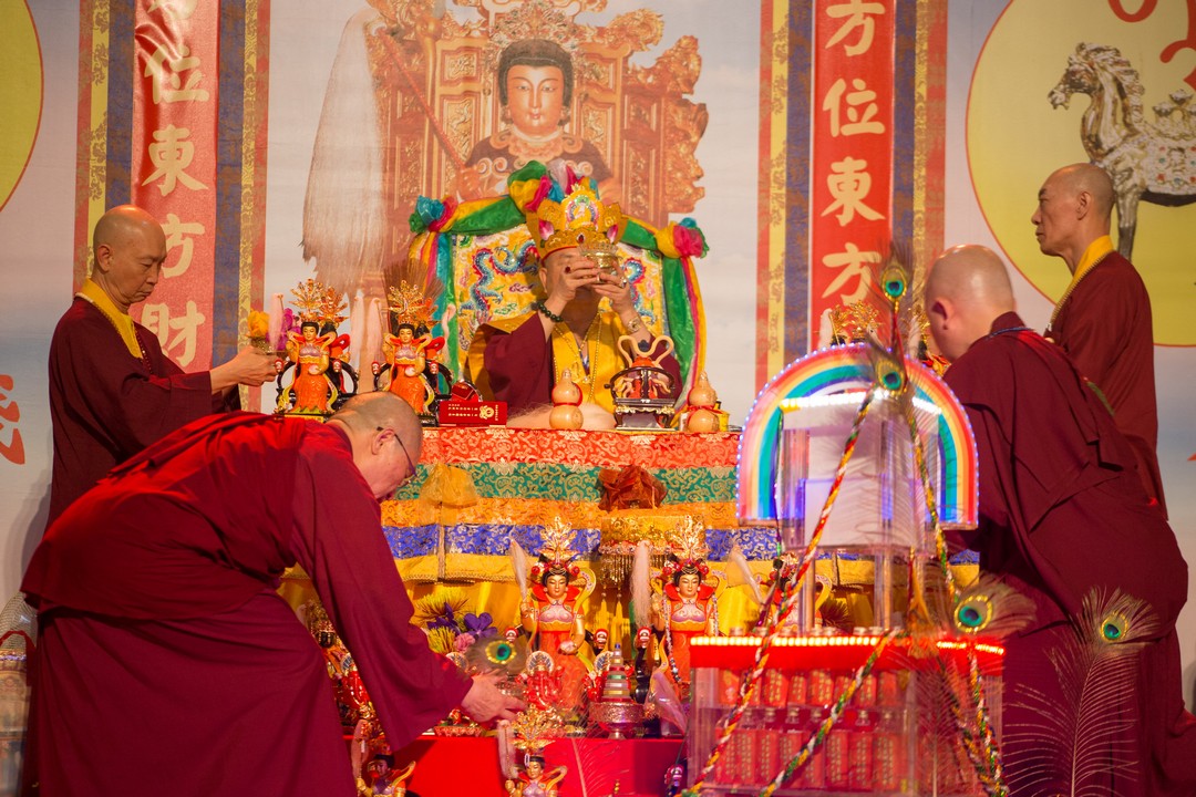 法王開示完畢,大眾抱以熱烈掌聲,感恩蓮生法王的寶貴開示。接著蓮生法王慈悲做總加持及打招財鼓,與師母蓮香上師、吐登悉地仁波切一同拉放新春彩球及敲響平安鑼,加持所有功德主接財神。最後賜授與會大眾「金面金母不共大法」灌頂,法會圓滿結束。