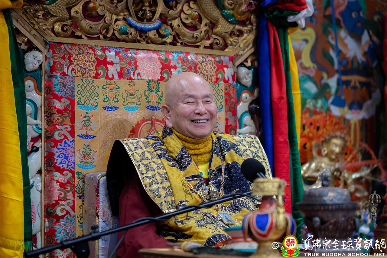 接著,法王繼續講解《大佛頂首楞嚴經》〈卷第四〉:「無上大悲清淨寶王,善開我心。能以如是種種因緣,方便提獎,引諸沈冥出於苦海。世尊。我今雖承如是法音,知如來藏妙覺明心遍十方界,含育如來十方國土,清淨寶嚴妙覺王剎。如來復責多聞無功,不逮修習。我今猶如旅泊之人,忽蒙天王賜與華屋,雖獲大宅,要因門入。惟願如來不捨大悲,示我在會諸蒙暗者,捐捨小乘,畢獲如來無餘涅槃本發心路。令有學者,從何攝伏疇昔攀緣,得陀羅尼,入佛知見。作是語已,五體投地。在會一心,佇佛慈旨。」