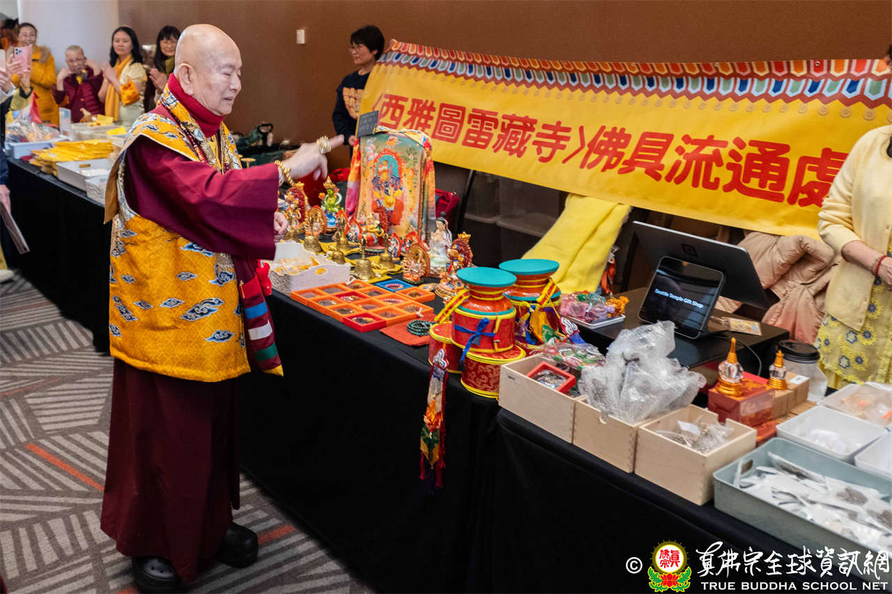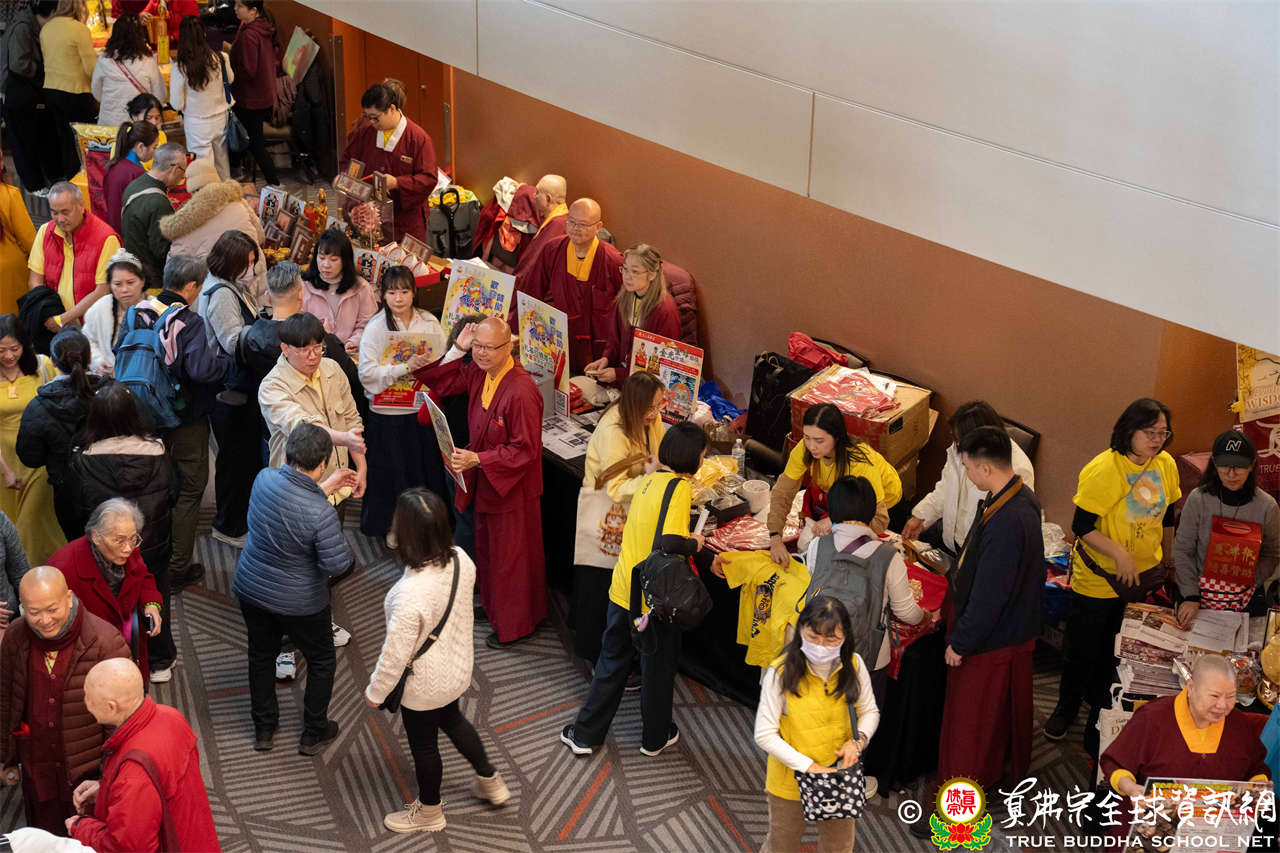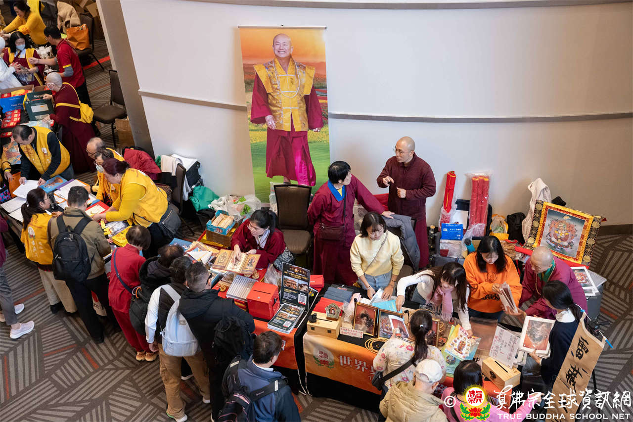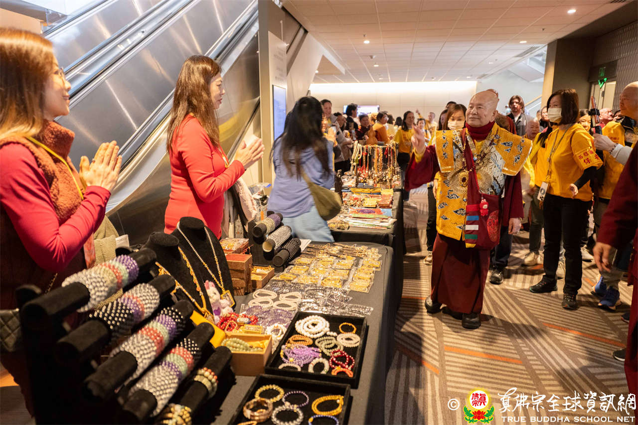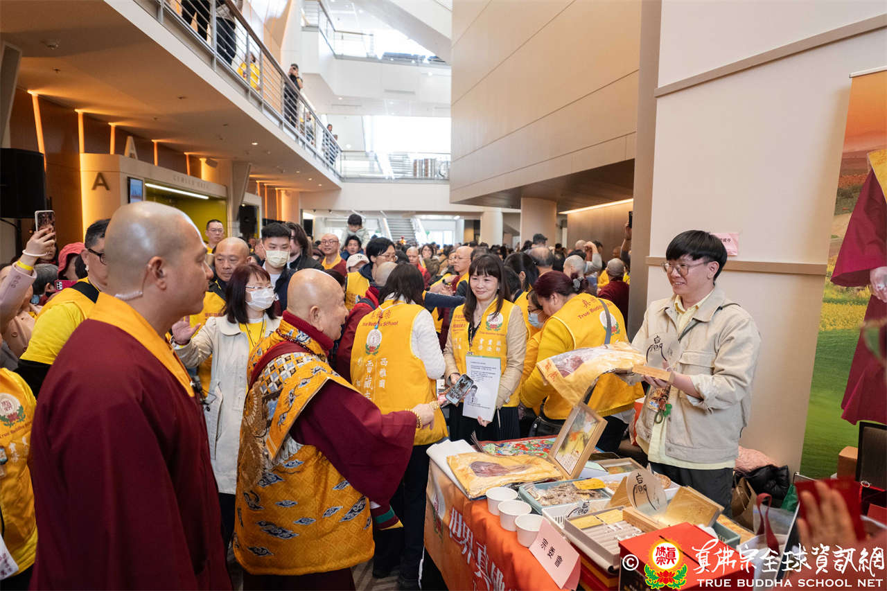 聖尊並巡視、加持會場周圍走廊的報名處與許多攤位。各攤位的佛具琳瑯滿目,人潮擠得水洩不通,大家寒暄問好、興高采烈,宛如嘉年華會,非常熱鬧。