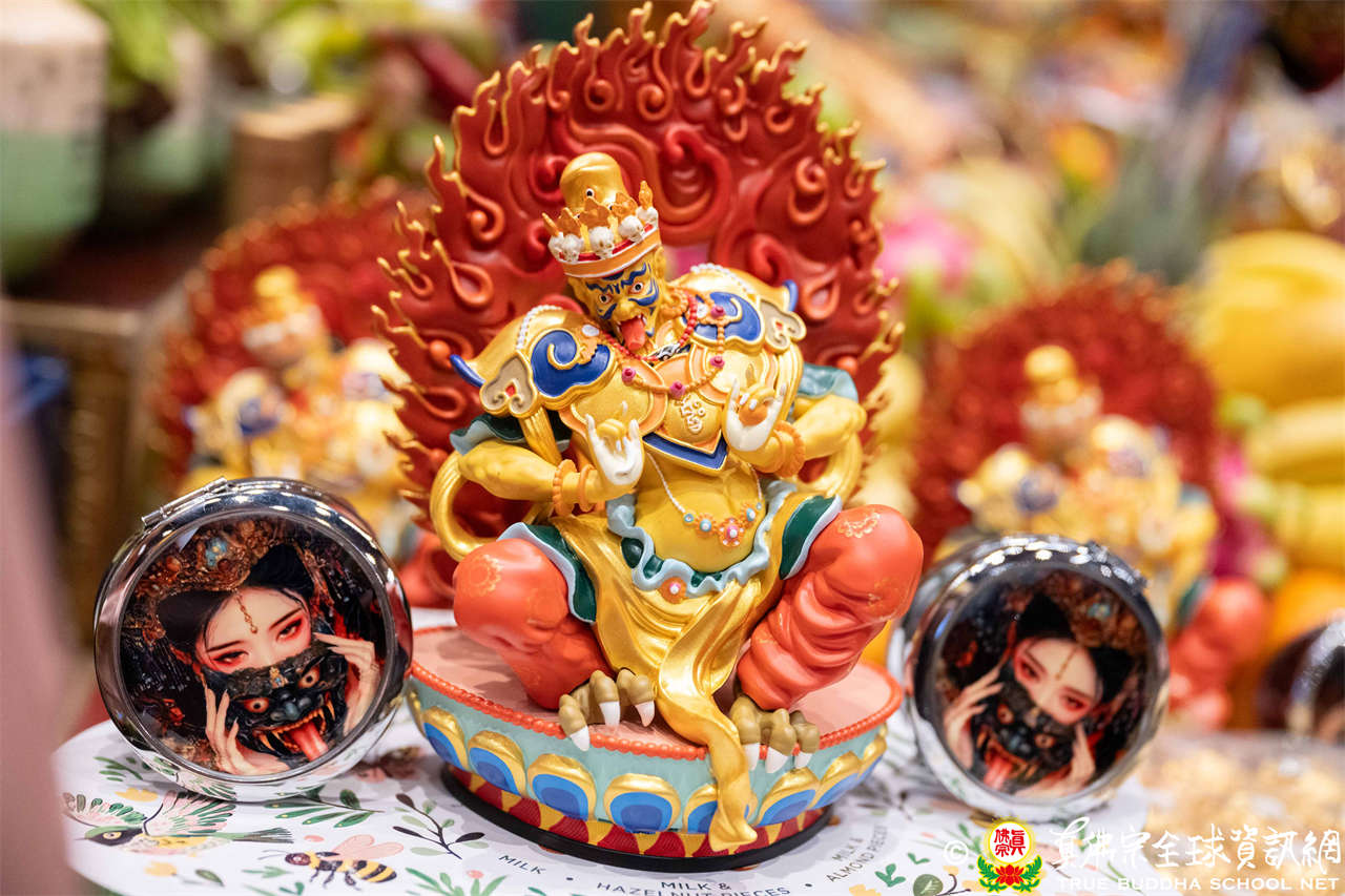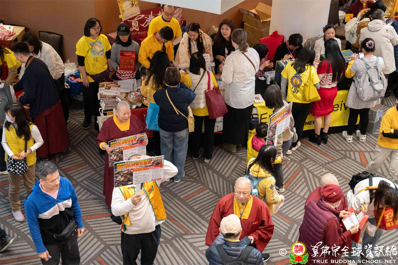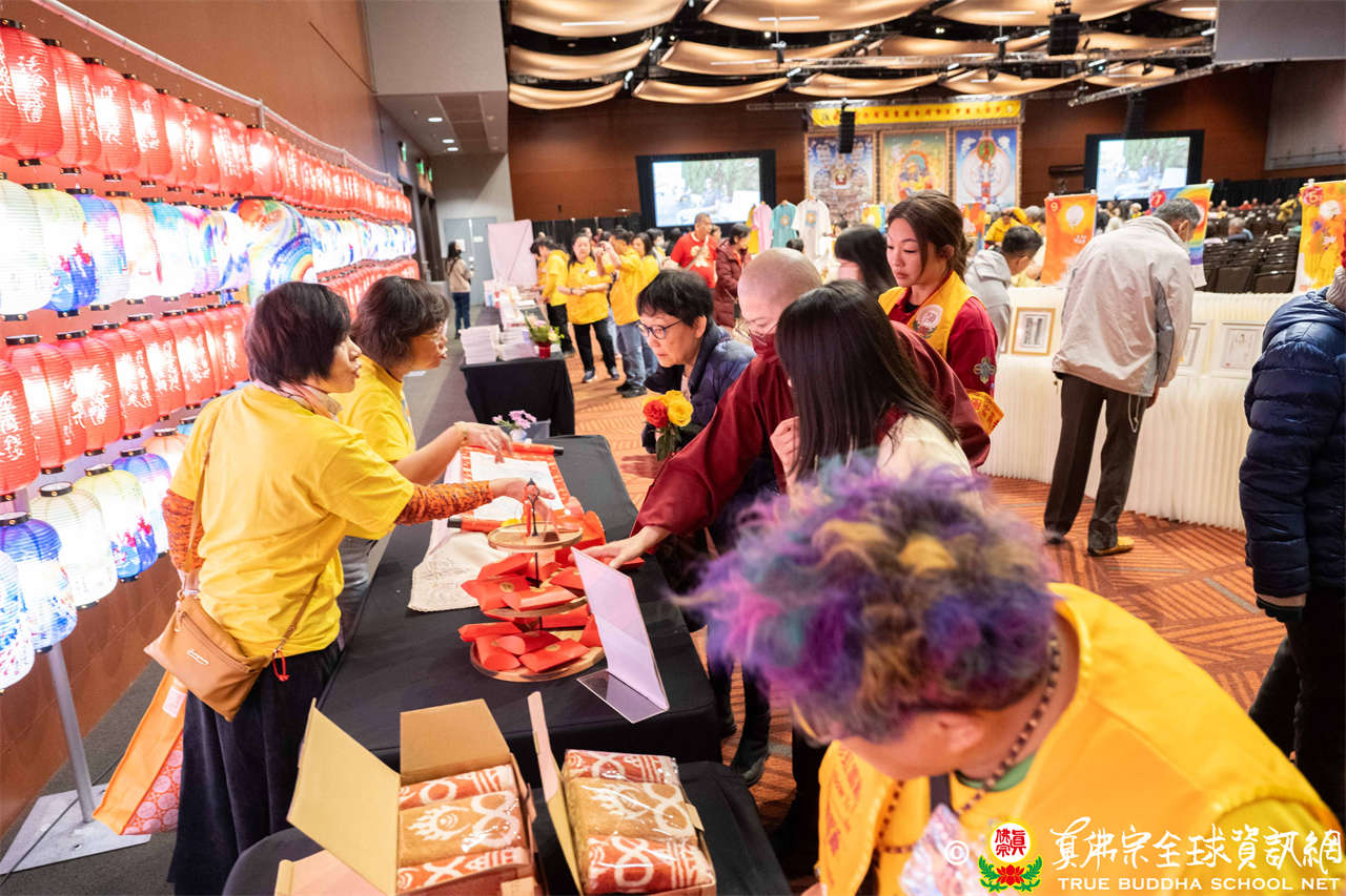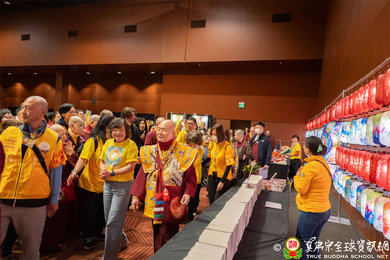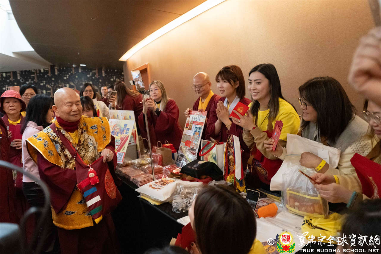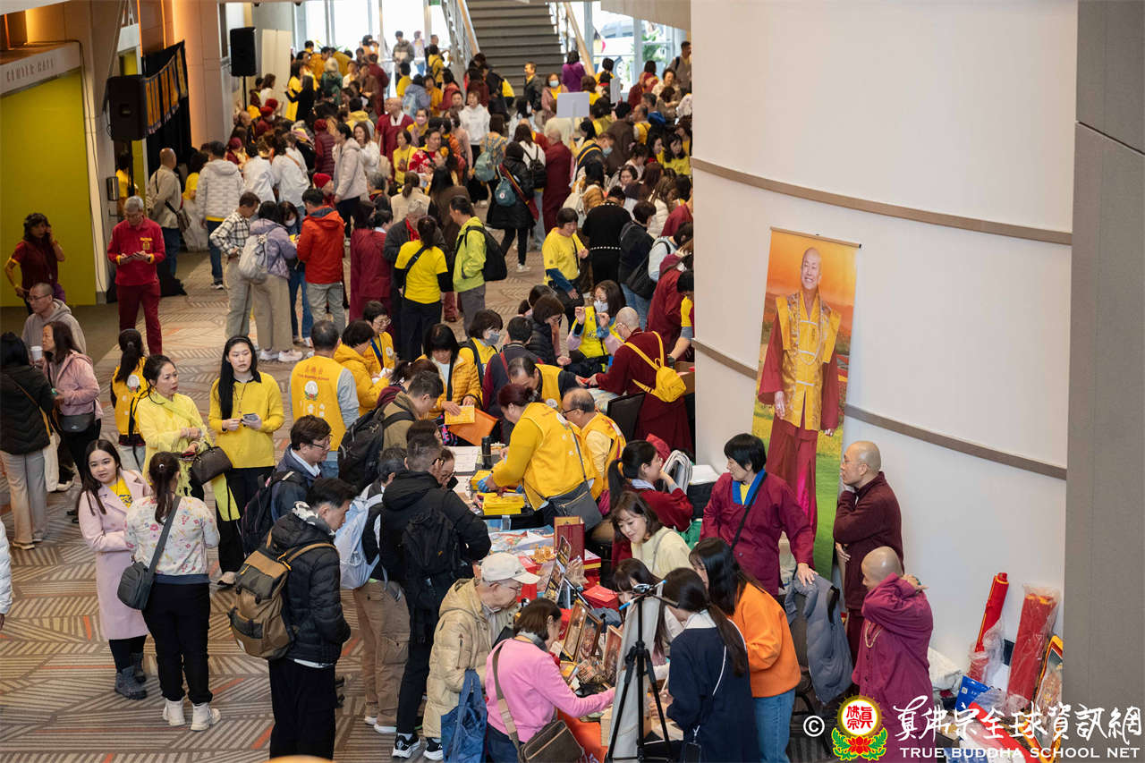 聖尊並巡視、加持會場周圍走廊的報名處與許多攤位。各攤位的佛具琳瑯滿目,人潮擠得水洩不通,大家寒暄問好、興高采烈,宛如嘉年華會,非常熱鬧。