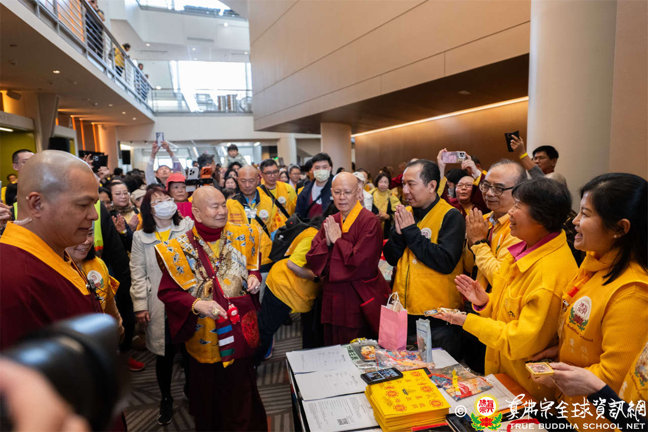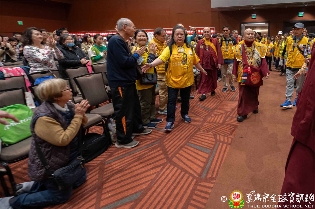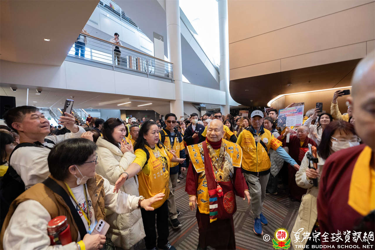 當日,蓮生活佛與師母蓮香上師座車抵達會場時,大眾早已懷著喜悅與期待之心恭候,當聖尊與師母步下座車,現場隨即響起熱烈掌聲,聲聲的問候洋溢著弟子們對聖尊的思念與敬仰,聖尊亦以親切笑容揮手回應,氣氛熱烈而溫馨