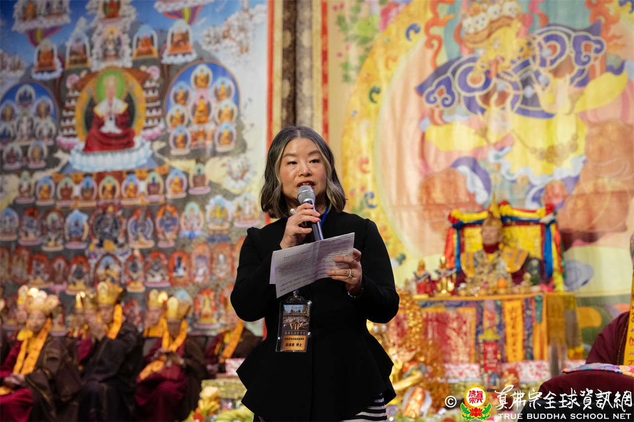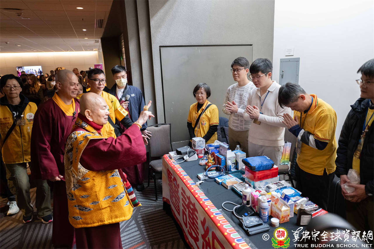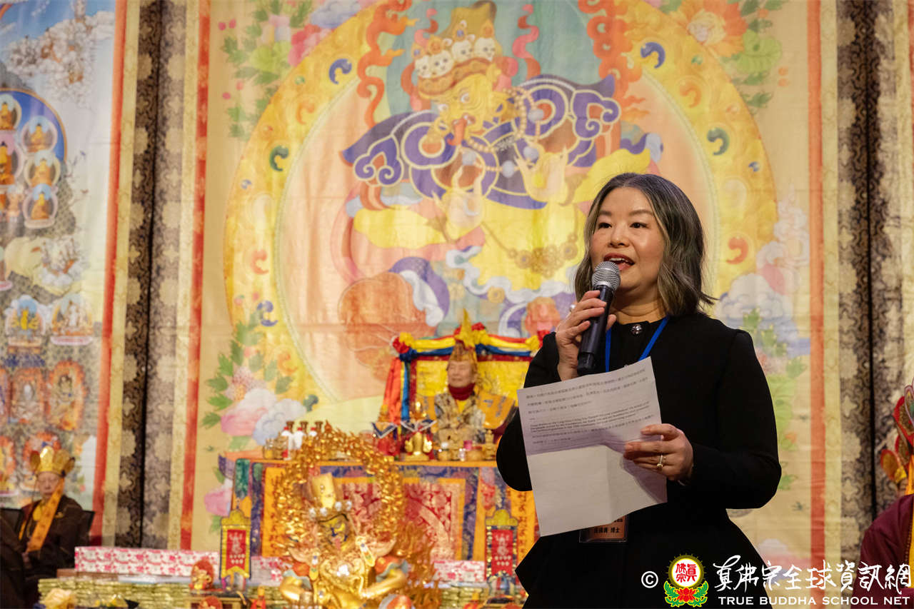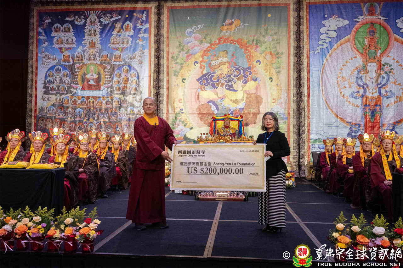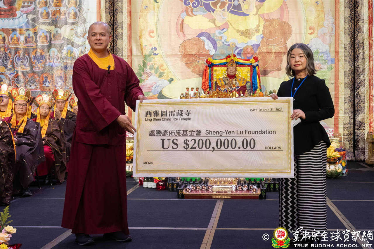 致詞結束後,西雅圖雷藏寺住持釋蓮吟上師代表捐贈善款20萬美元予盧勝彥佈施基金會,以此拋磚引玉,呼籲大眾響應慈悲善行,共同造福人群。
