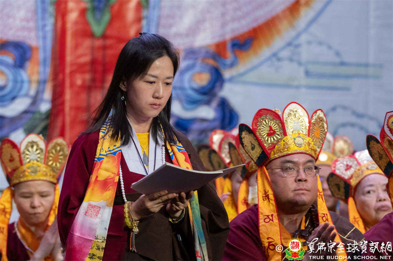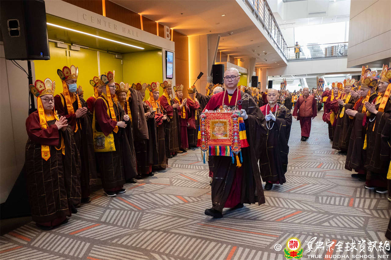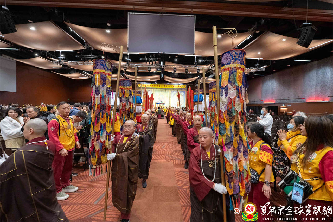 下午二時整,磬聲響起,四眾弟子虔誠合掌,齊聲唱誦蓮花童子心咒,恭迎根本傳承上師聖尊蓮生活佛入壇。聖尊牽著孫女盧音一同步入會場,畫面溫馨動人。聖尊、眾長老及上師團進入壇場,法會正式揭開序幕。