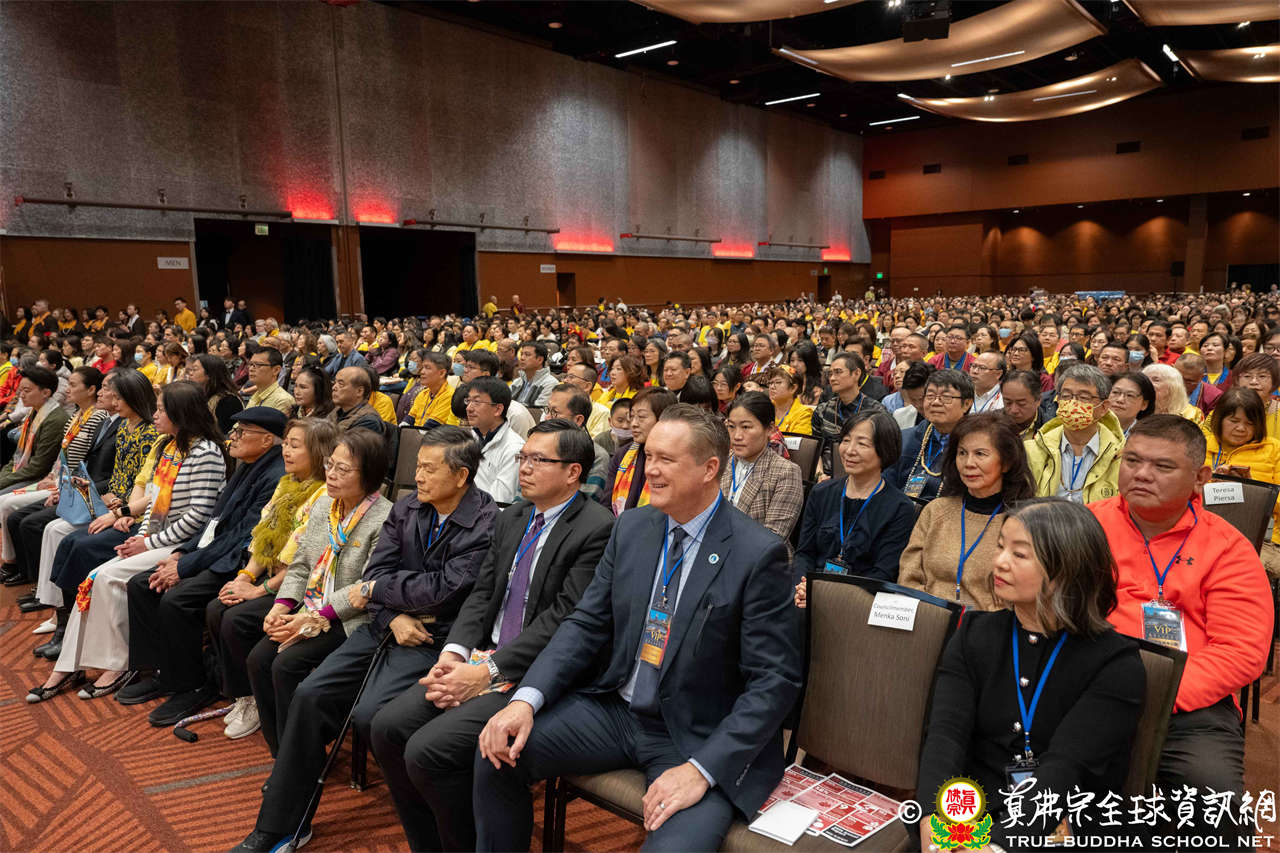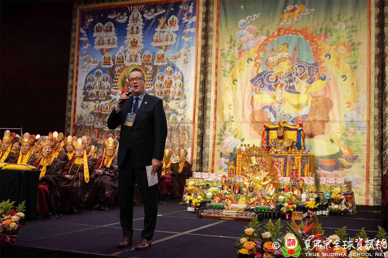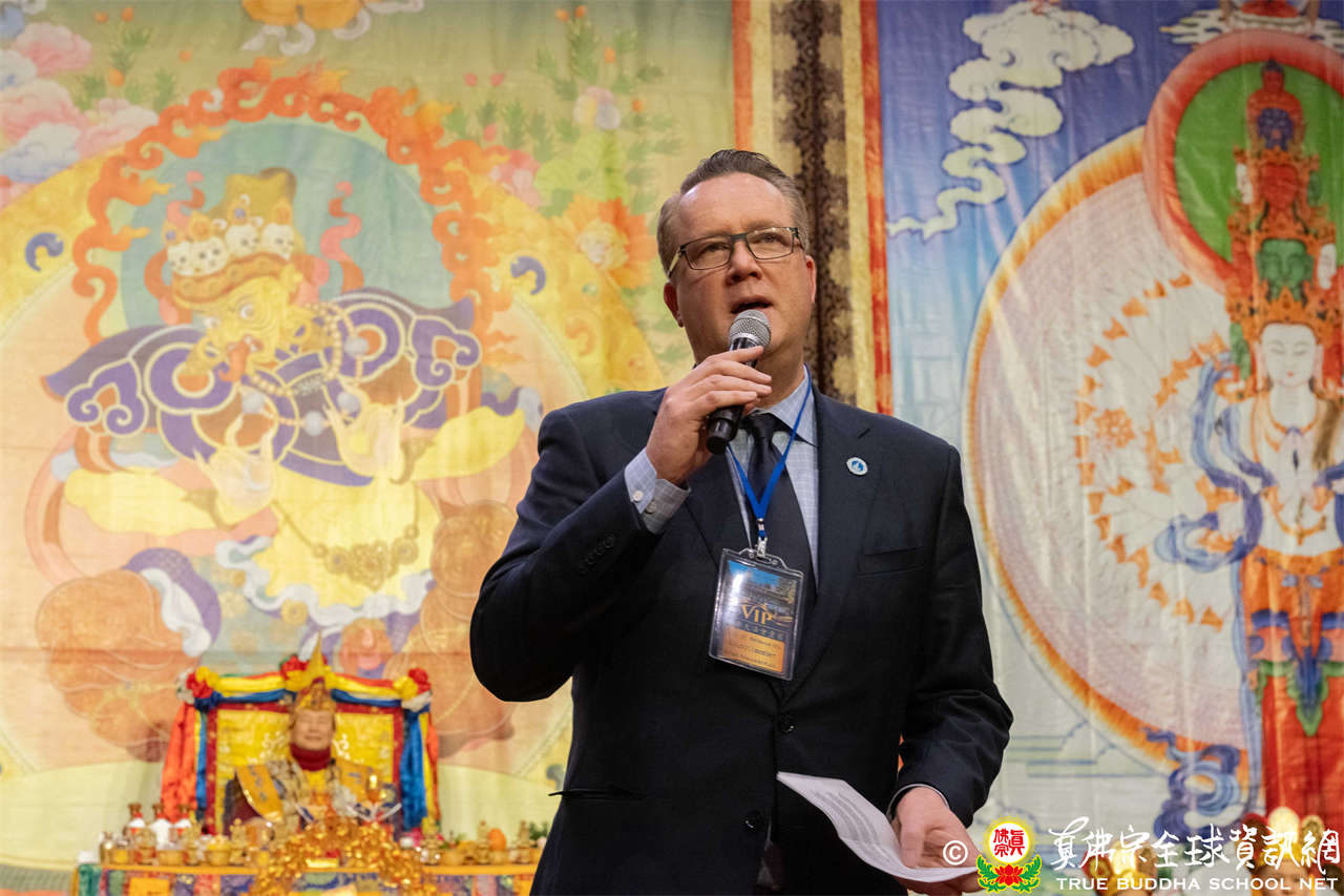 隨後,Bellevue市議員Jared Nieuwenhuis致詞表示,感謝與會大眾的到來,並介紹Bellevue為一座融合多元文化、充滿慈悲與社區精神的城市,期盼與會者皆能感受到社區的溫暖與熱情,並祝願本次法會為大眾帶來祝福。