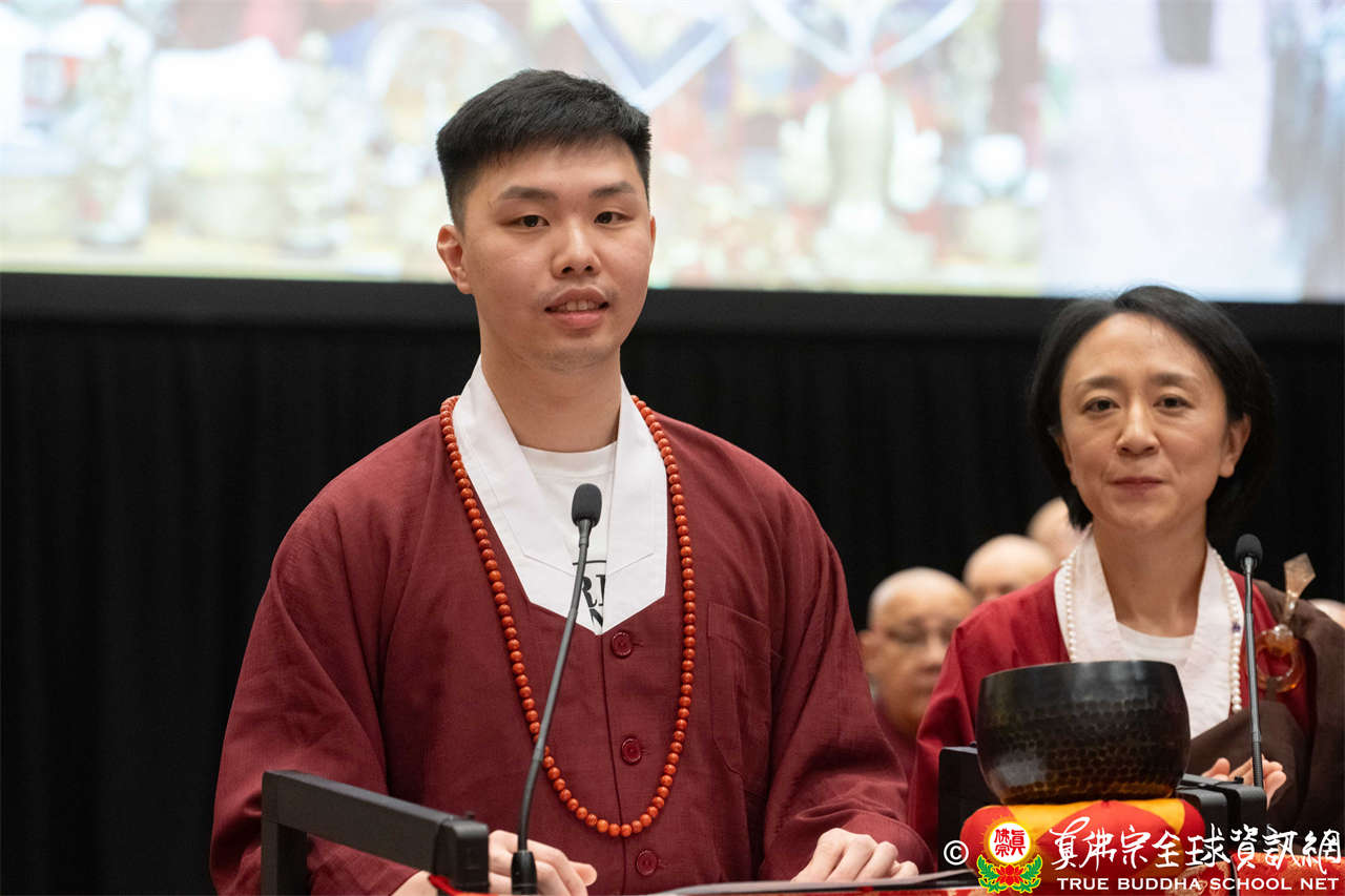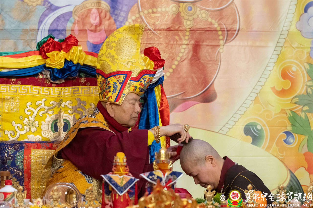 發心受在家菩薩戒者共19人。聖尊詢問諸位戒子是否自願信守在家菩薩戒而不犯?眾等皆虔誠答「是」。一問一答之間,就是得戒。聖尊開示,在家菩薩戒戒律繁多,剛開始時,於修法中應每日誦念所有戒條,並勉勵其莫忘初心。聖尊搖動金剛鈴與手鼓,叮囑戒子們將金剛鈴聲與鼓聲放在心中,身為菩薩行者當要上求佛果、下化眾生。