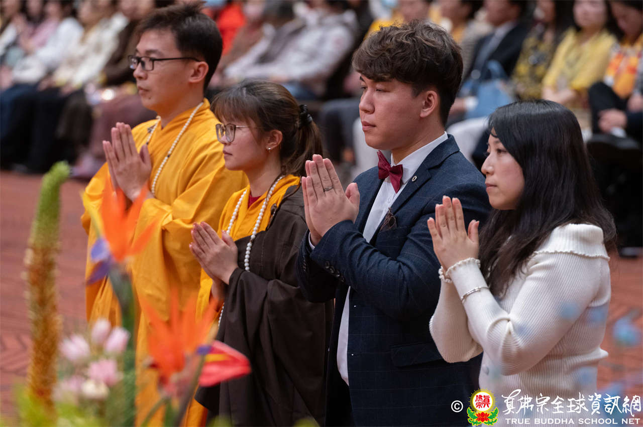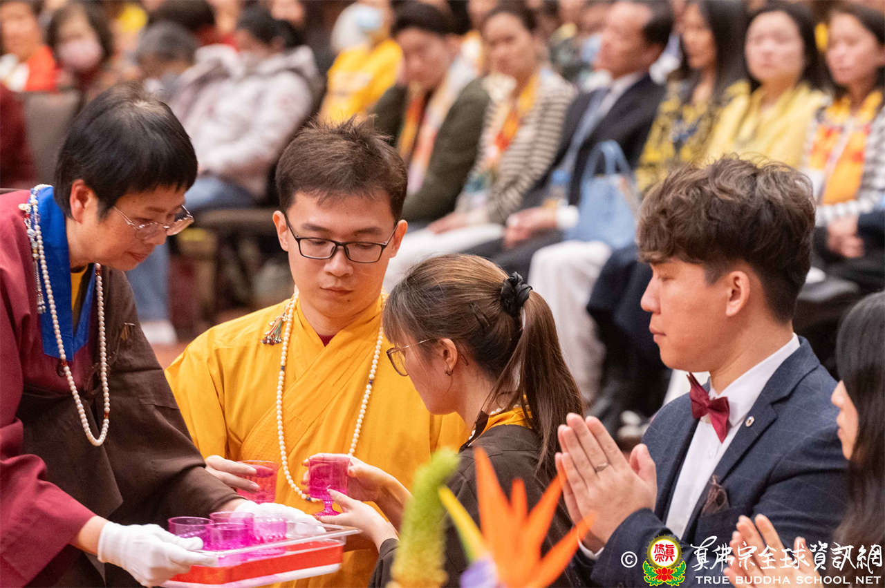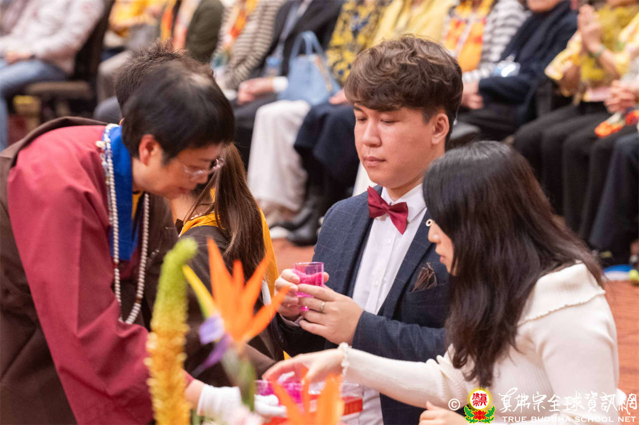 聖尊為兩對新人做福證,並勉勵他們,在漫漫的人生路途中,要彼此永遠相互敬愛是很不容易的事,然於佛菩薩加持與見證下,一定要堅守對彼此的誓言,無論如何要互相體諒、寬容對方。