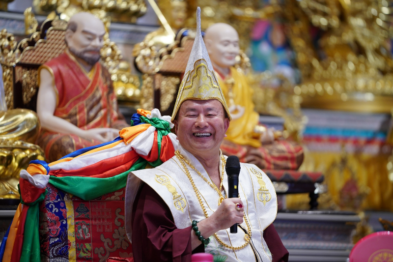 最後,法王祝賀大家身體健康、彌勒菩薩加持大家吉祥如意、資糧具足、升官發財!活在「二元世界」裡面時,得到善果,再超越「二元」達到「一元」的境界!法王接著賜授「彌勒菩薩不共法、彌勒白雲觀」灌頂,法會圓滿。
