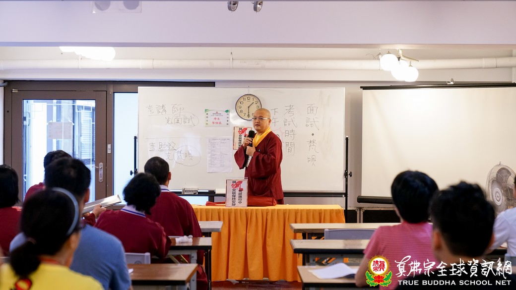 如同13日為各位考生解釋考試流程,14日也是由蓮東上師,在考前為大家再次簡要說明各項考試的注意事項與進行方式,多虧了上師風趣的解說,原本表情緊張的考生們,臉上多了笑容,放鬆許多。