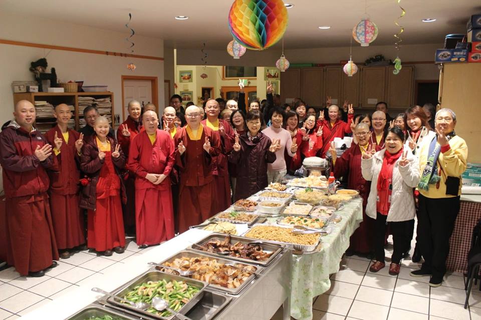 用餐時刻, 雷藏寺的眾上師法師陸續來到餐廳, 慈悲的師母蓮香上師也出席聚餐, 眾人一起拍照留念, 在超度供養儀軌完成後, 香噴噴的各式菜餚引人食指大動, 大家用餐時閒話家常其樂陶陶, 餐後的摸彩活動更是讓氣氛熱烈起來,人人都有獎, 大家好奇打開禮物看看自己是否抽到大獎了, 此時師母也提供30份抽獎禮物是美國特別發行的羊年賀卡, 每張賀卡內都附有一張一元美金並有888這個吉祥數字, 象徵新的一年大發特發, 大家感謝師母的禮物也分享新年發發發的喜氣, 彼此祝賀共度佳節。